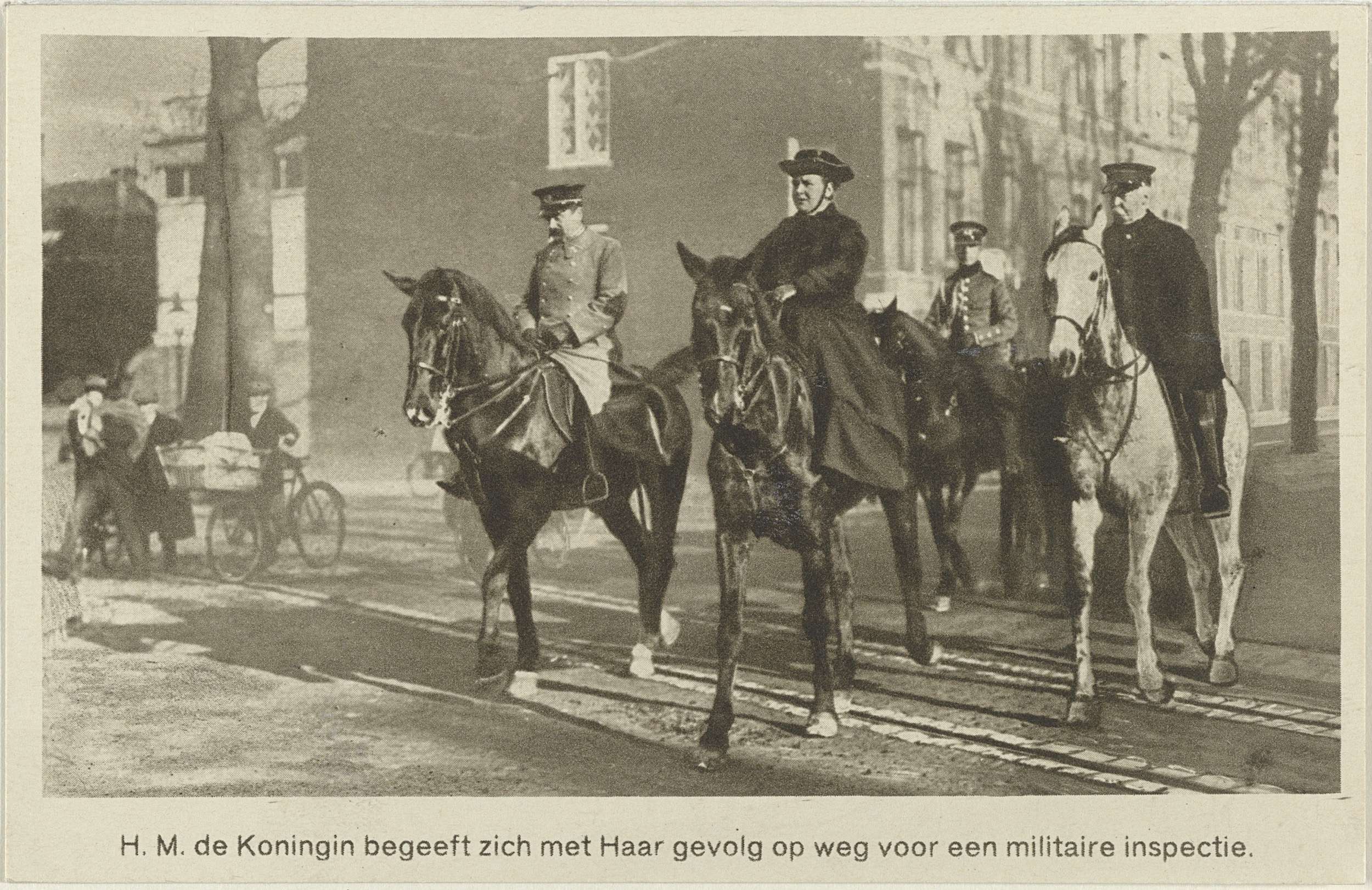 Wilhelmina begeeft zich met haar gevolg op weg voor een militaire inspectie. In de ondermarge een regel Nederlandse tekst.