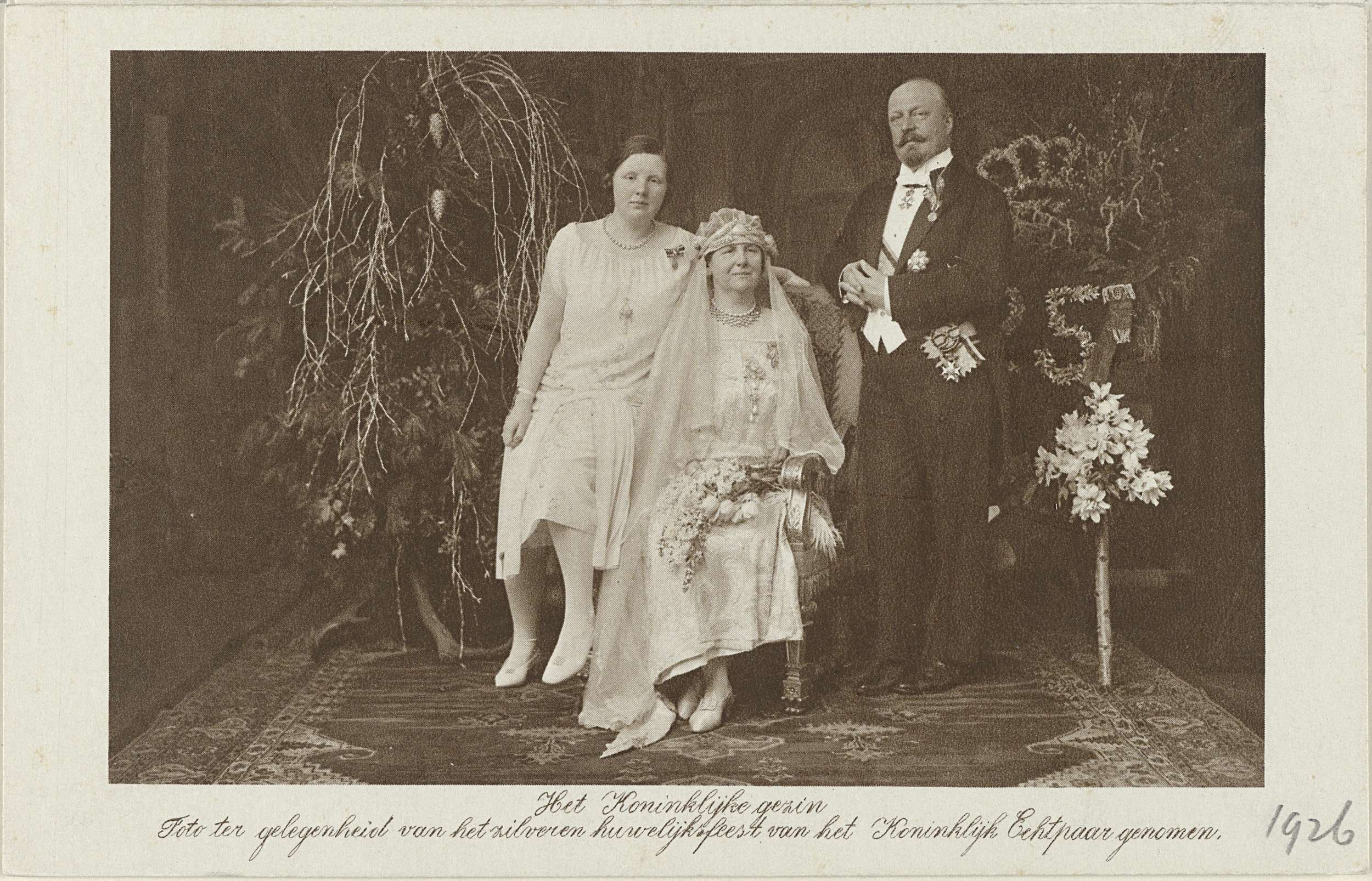 Portret van Wilhelmina, Hendrik en Juliana. Rechts het getal '25'. In de ondermarge twee regels Nederlandse tekst. Vervaardigd ter gelegenheid van het 25-jarig huwelijksjubileum van Wilhelmina en Hendrik in 1926.