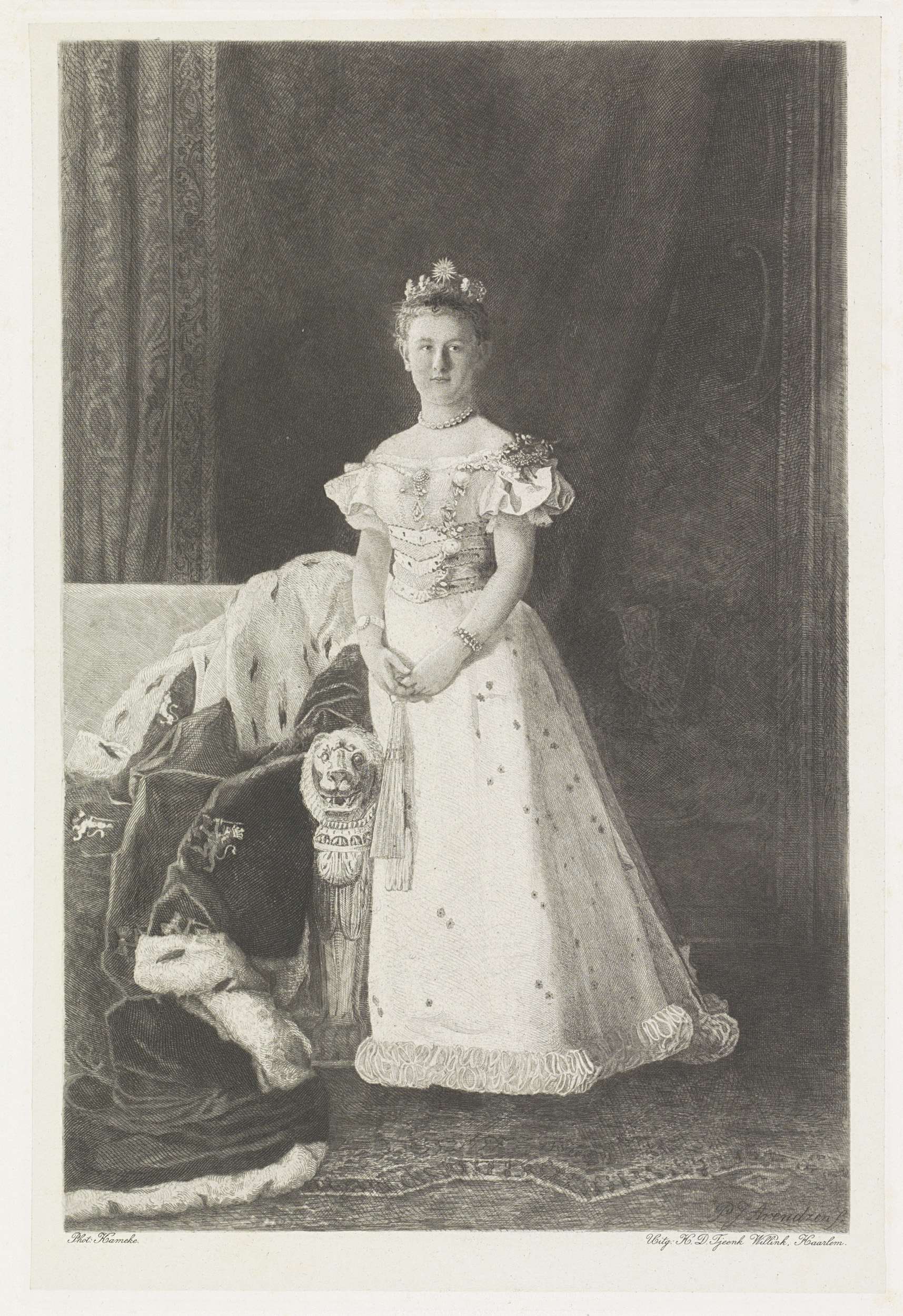 Portret van Wilhelmina. In haar handen een waaier. Links een hermelijnen mantel.