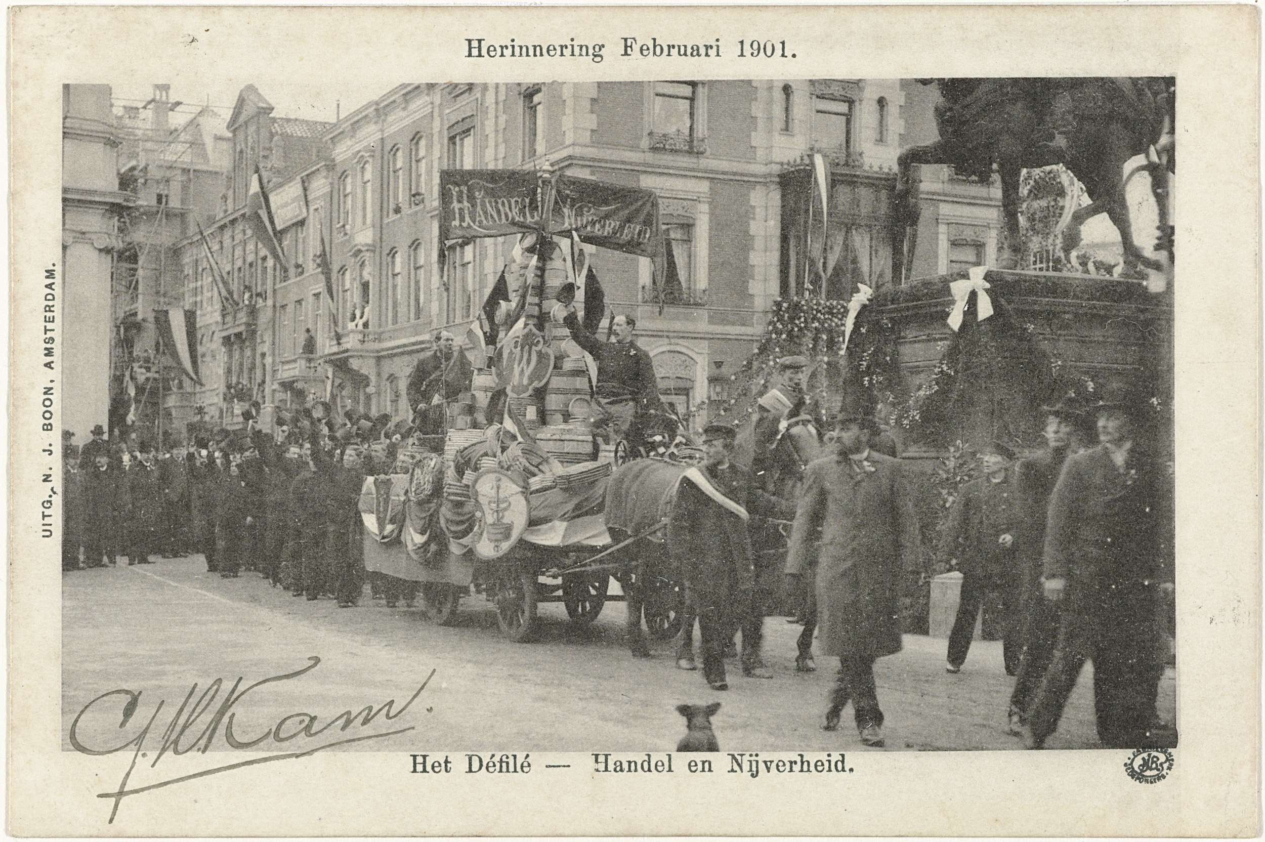 Defilé bij het huwelijk van Wilhelmina en Hendrik te Den Haag op 7 februari 1901. In de bovenmarge en in de ondermarge een regel Nederlandse tekst.