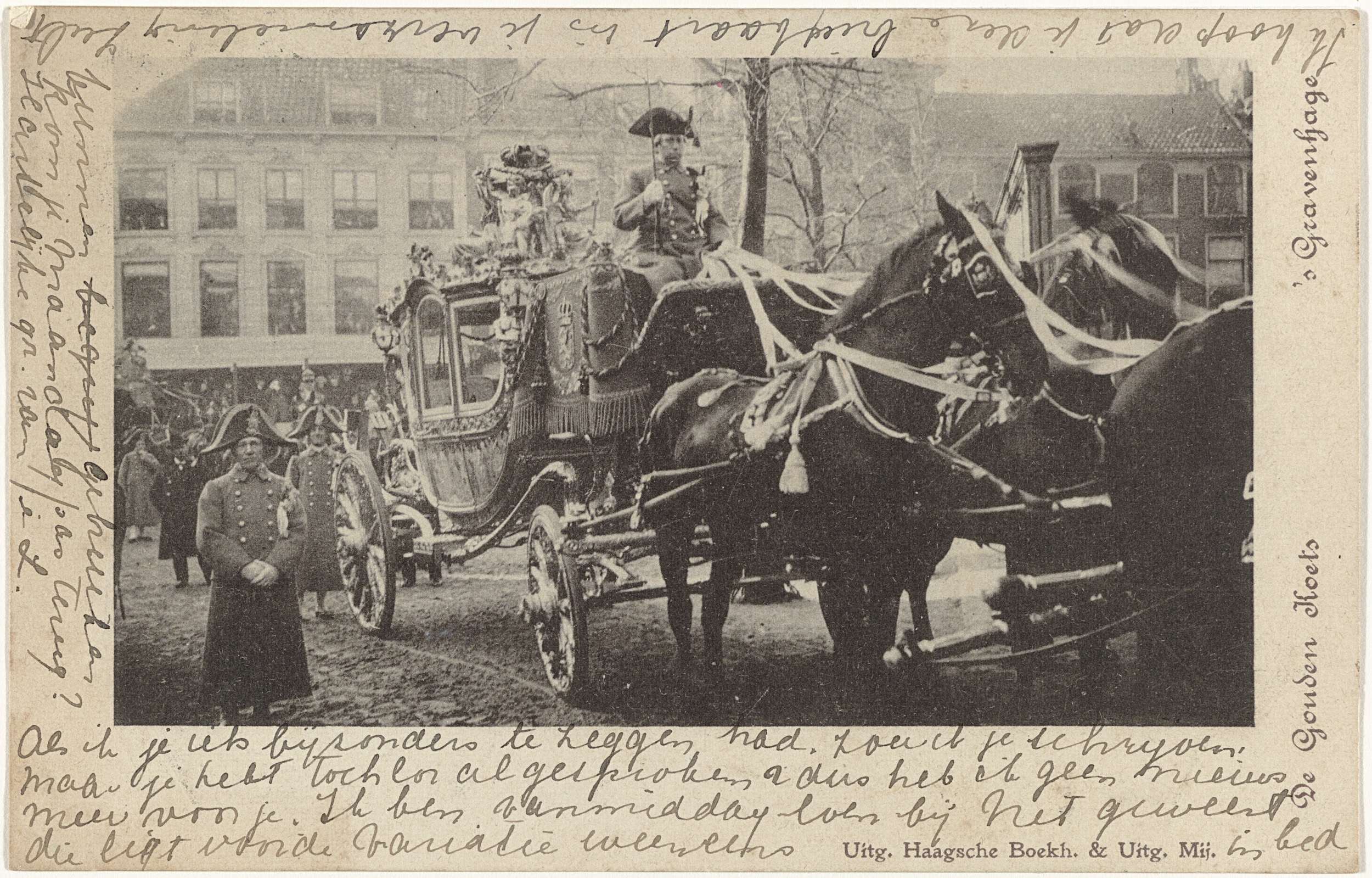 De gouden koets van de huwelijksstoet van Wilhelmina en Hendrik te Den Haag op 7 februari 1901. In de rechtermarge een regel Nederlandse tekst.