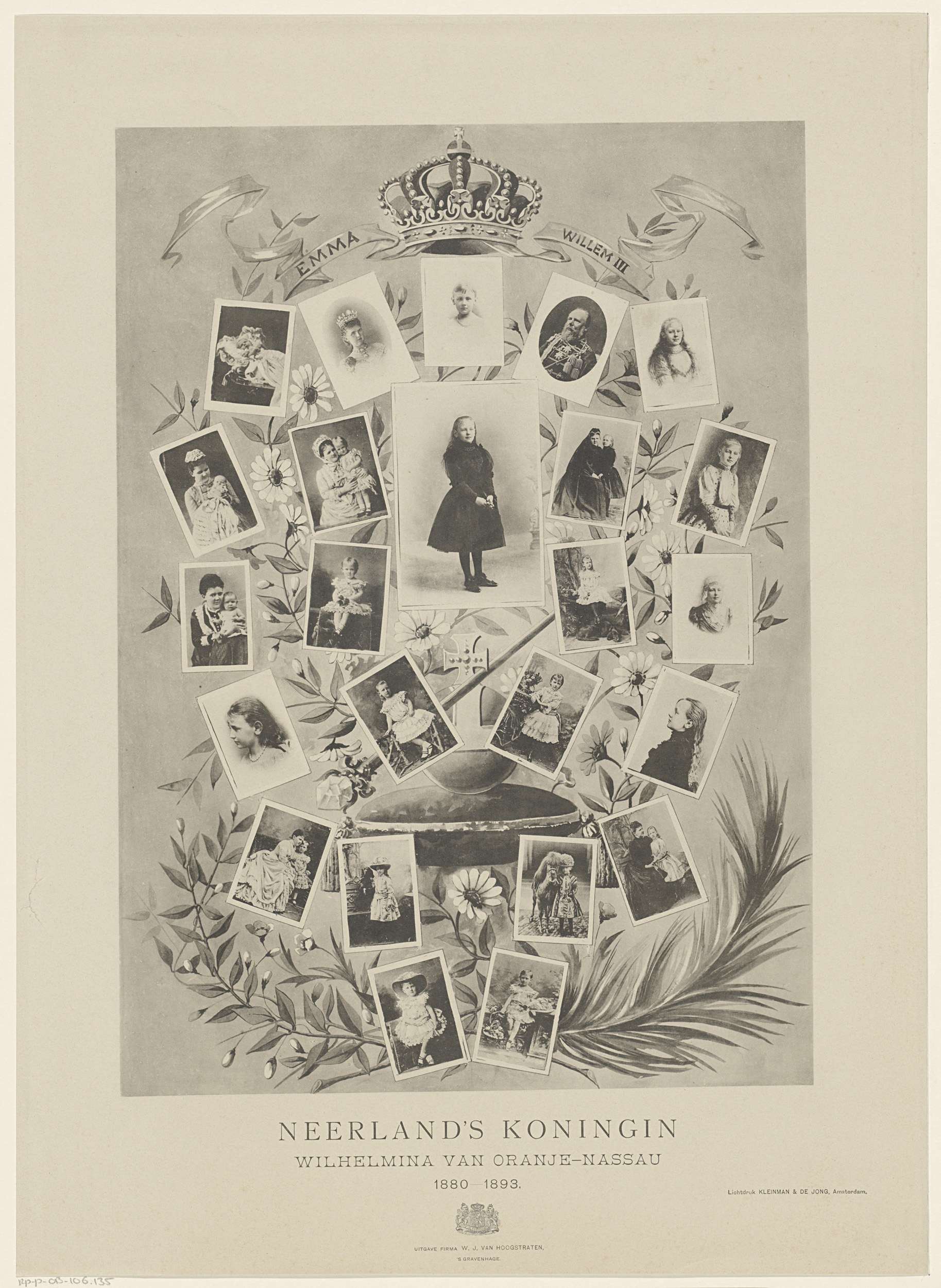 Portretten van Wilhelmina, Emma en Willem III, elk in een rechthoek. Op de achtergrond bloemen, takken en een kussen met daarop een scepter en de rijksappel. Daarboven een kroon en twee banderollen met de namen 'Emma' en 'Willem III'. In de ondermarge drie regels Nederlandse tekst.