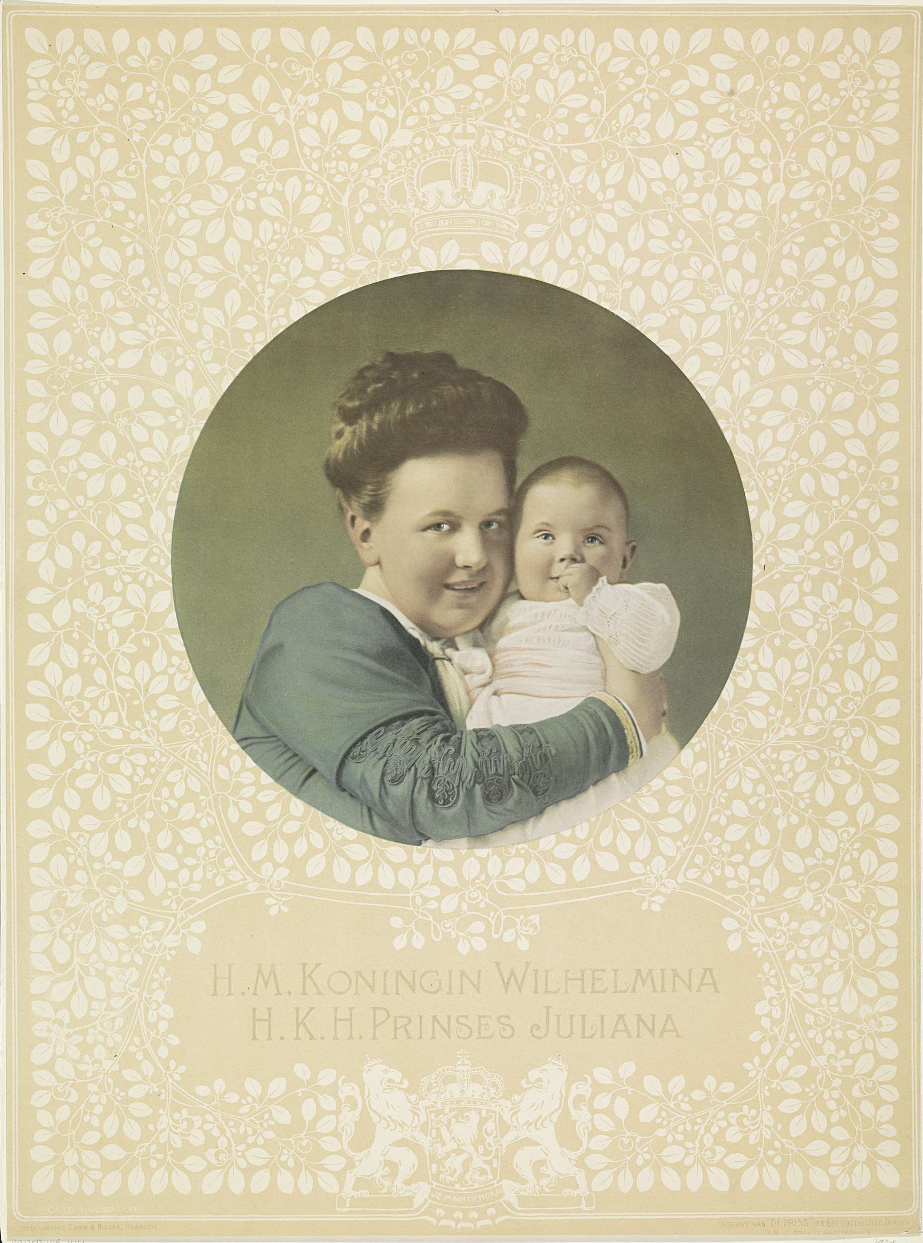 Portret van Wilhelmina en Juliana in een cirkel met eronder hun namen en titels. Daar omheen takken van een oranjeboom met bladeren en vruchten. Midden boven een kroon. Midden onder een wapen met een kroon en twee leeuwen.