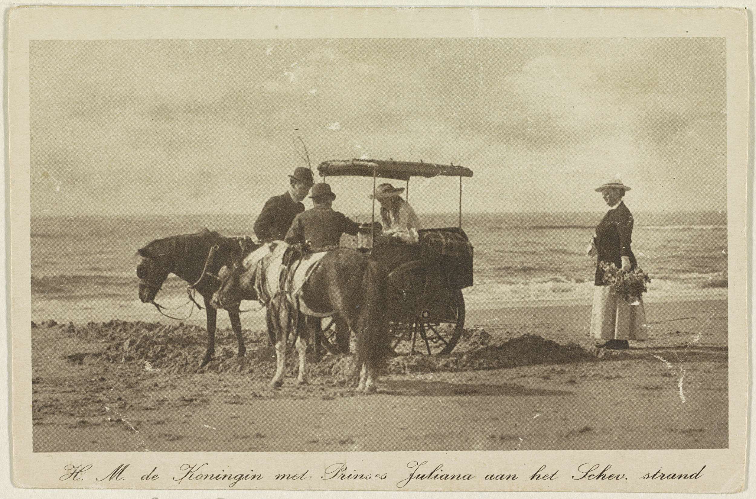 Wilhelmina en Juliana met een rijtuig op het strand te Scheveningen. In de ondermarge een regel Nederlandse tekst.
