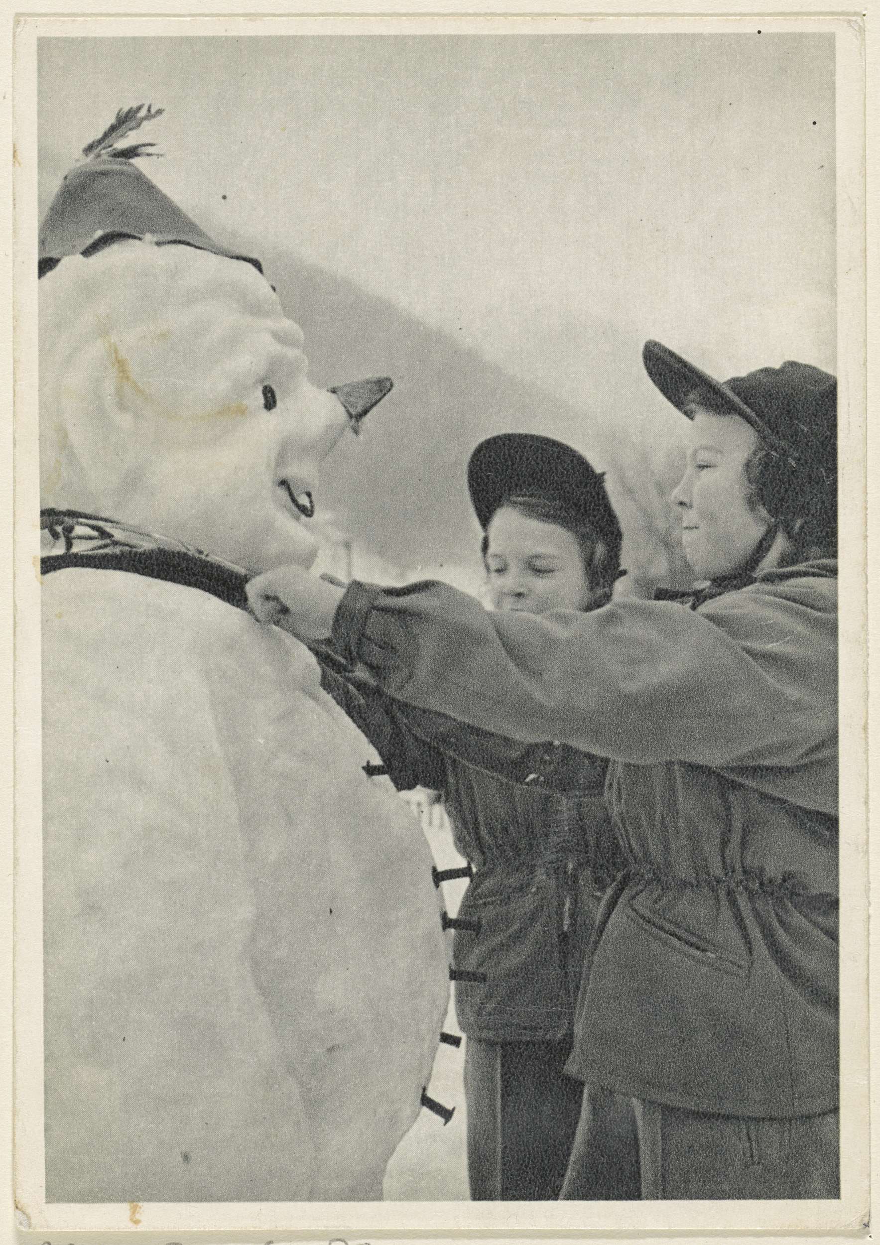 Beatrix en Irene maken een sneeuwpop op vakantie te Sankt Anton.