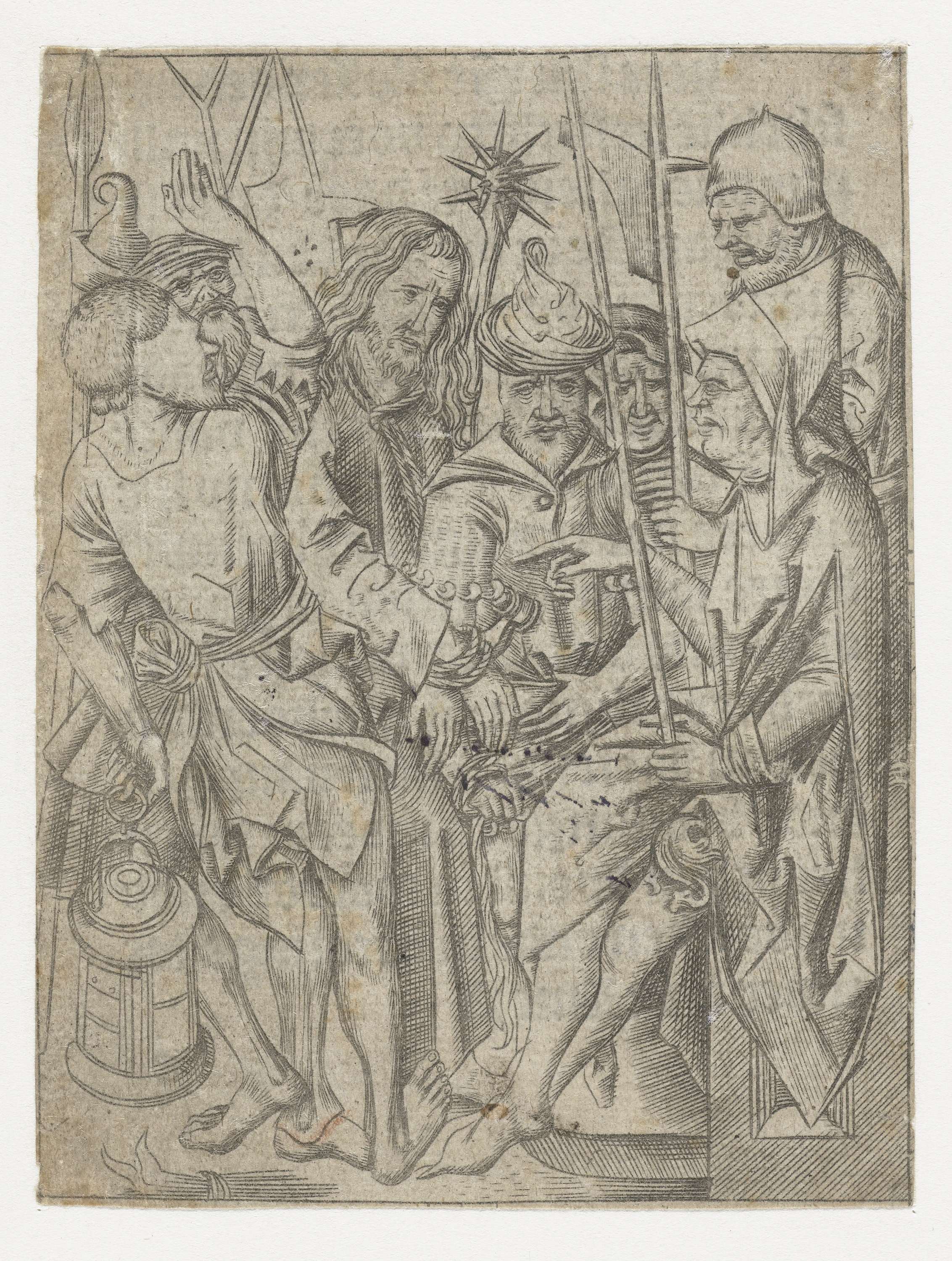 Christus staat, gebonden aan hals en handen en omringd door gewapende mannen, voor een man op een troon (Annas). Op versozijde een deel van een handgeschreven Nederlandse tekst in gotisch schrift.