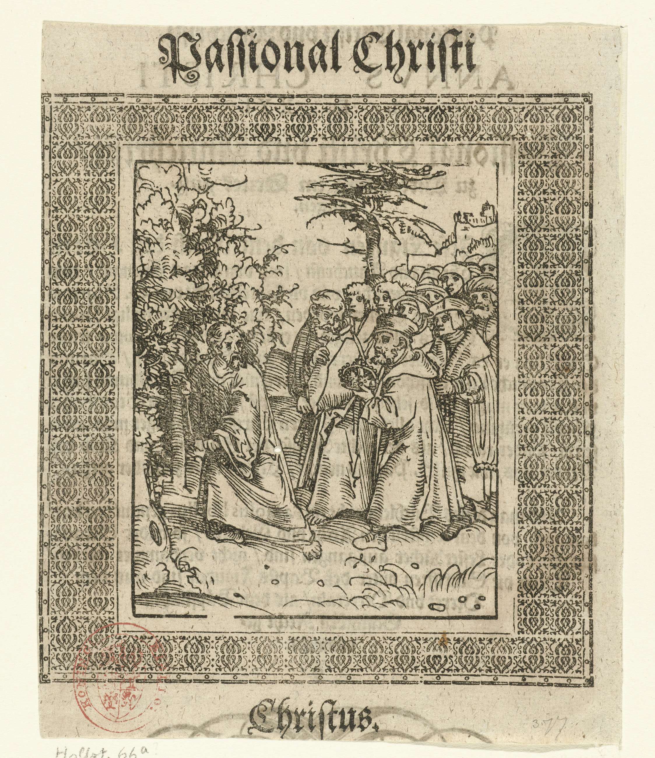 Christus vlucht voor de joden die hem willen kronen. Boekillustratie met rechthoekige omlijsting met fijne ornamenten. De prent is gedrukt met meerdere houtblokken.