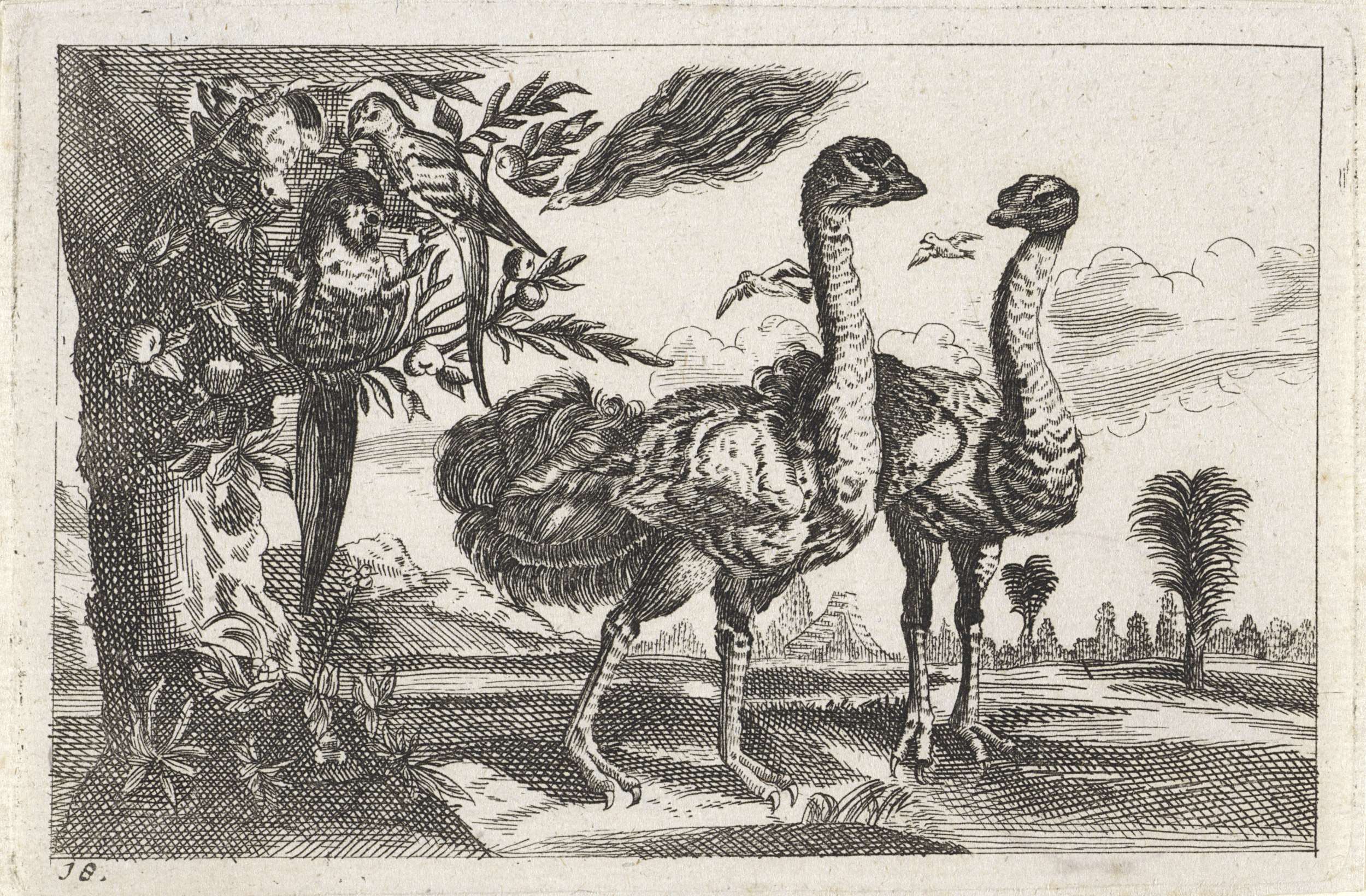 Twee struisvogels, in de boom rechts zitten twee papagaaien en een uil. In de verte een piramide.