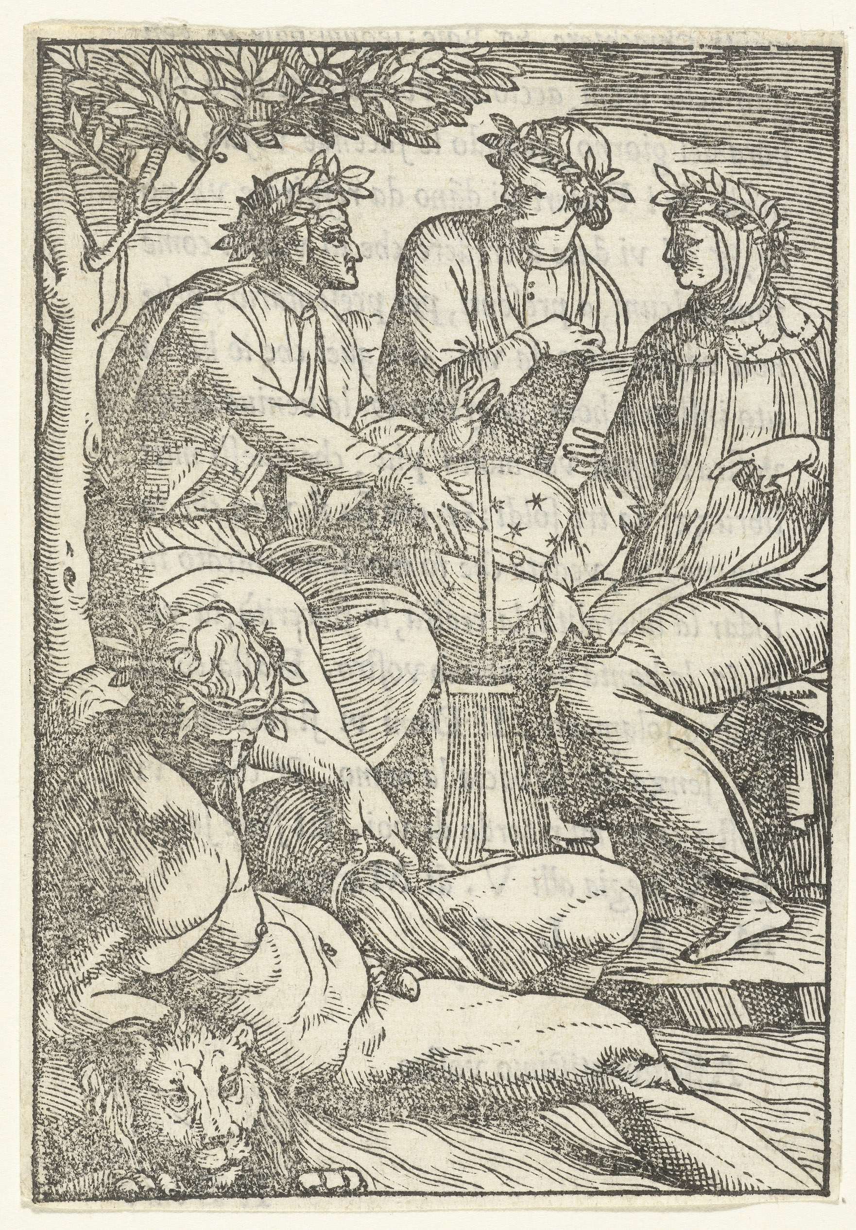 Drie geleerden in gesprek bij een hemelglobe. Links voor een liggende riviergod. Op het verso staat Italiaanse boekdruk
