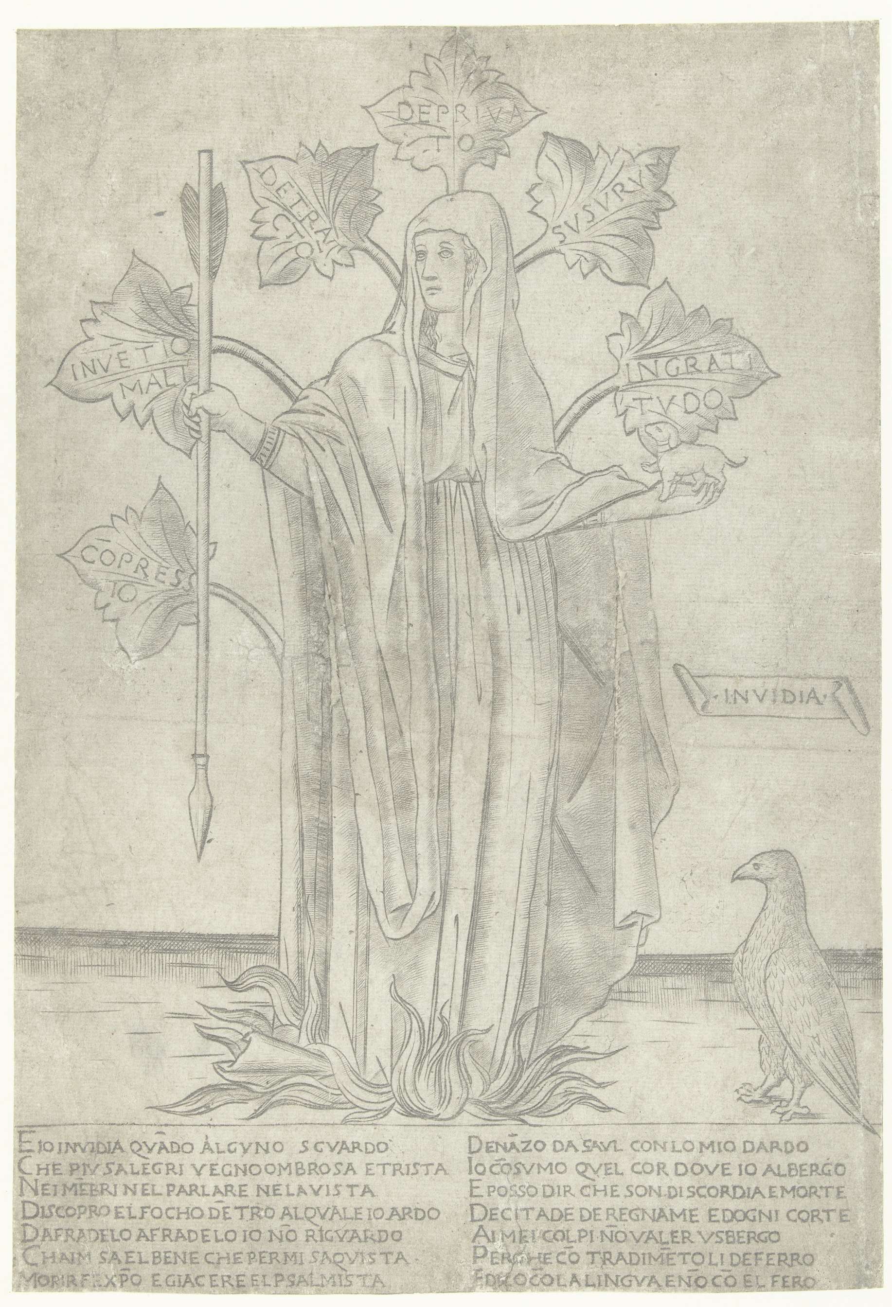 Allegorie op de hoofdzonde Afgunst met vrouw staand in vuur met pijl en kleine hond in haar handen. Achter haar zijn bladeren weergegeven met daarop de Latijnse termen voor de overige zes hoofdzonden. Op de grond zit een roofvogel. Onder de voorstelling staat een Latijns vers in twee coupletten van zeven regels.