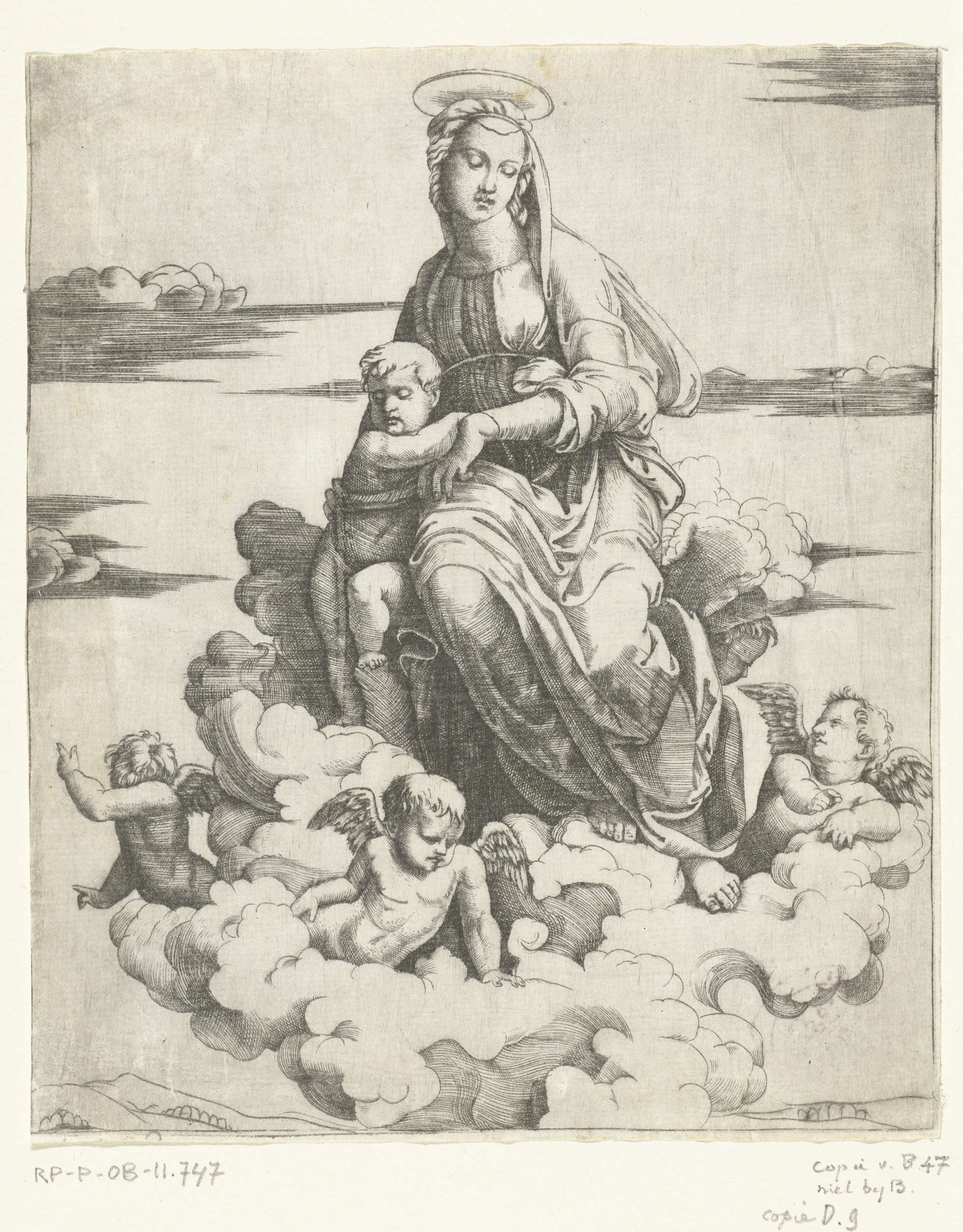 Maria met kind zittend op wolken omringd door engelen