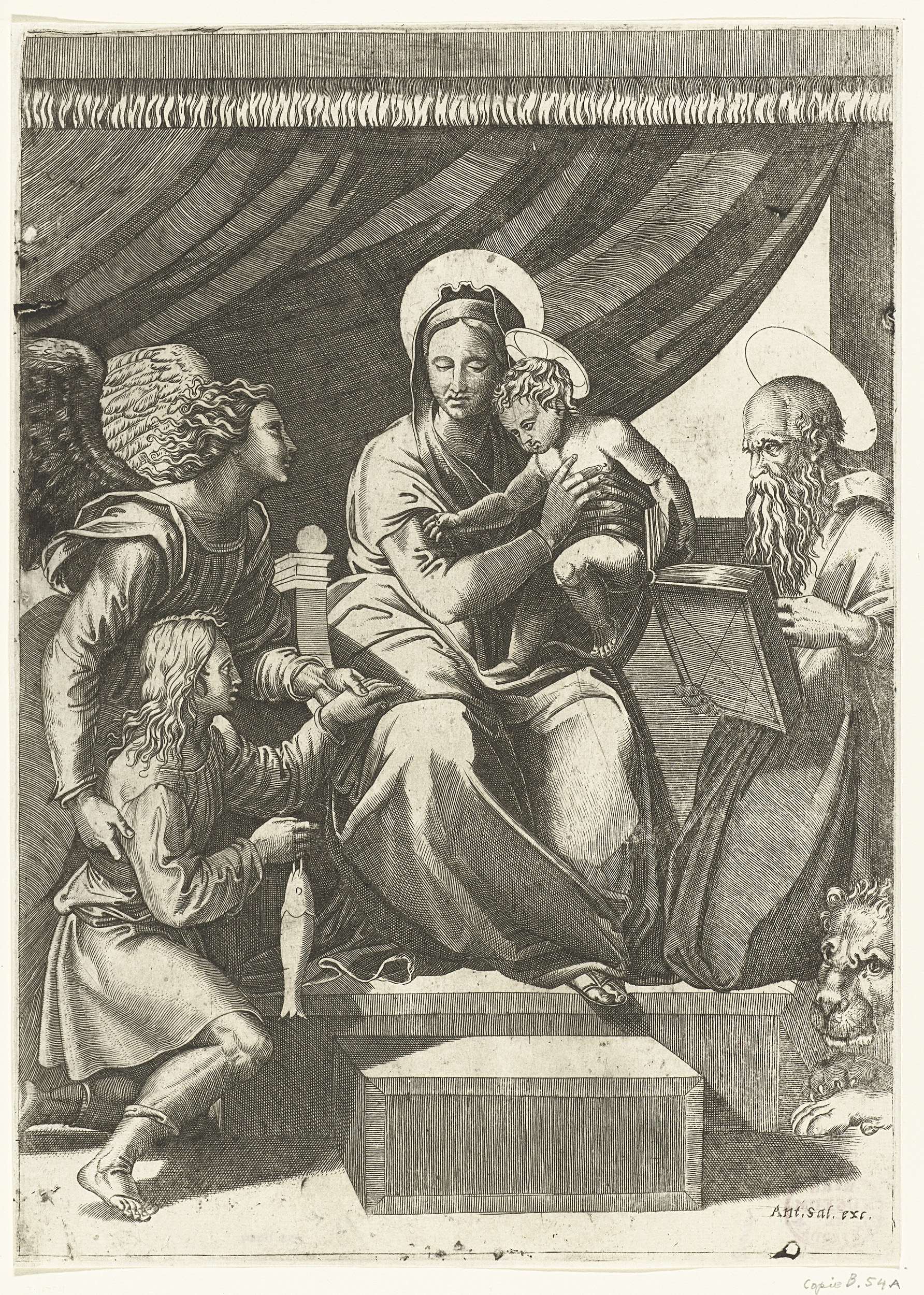 Maria met kind geflankeerd door aartsengel Michaël met Tobias met vis en heilige Hieronymus