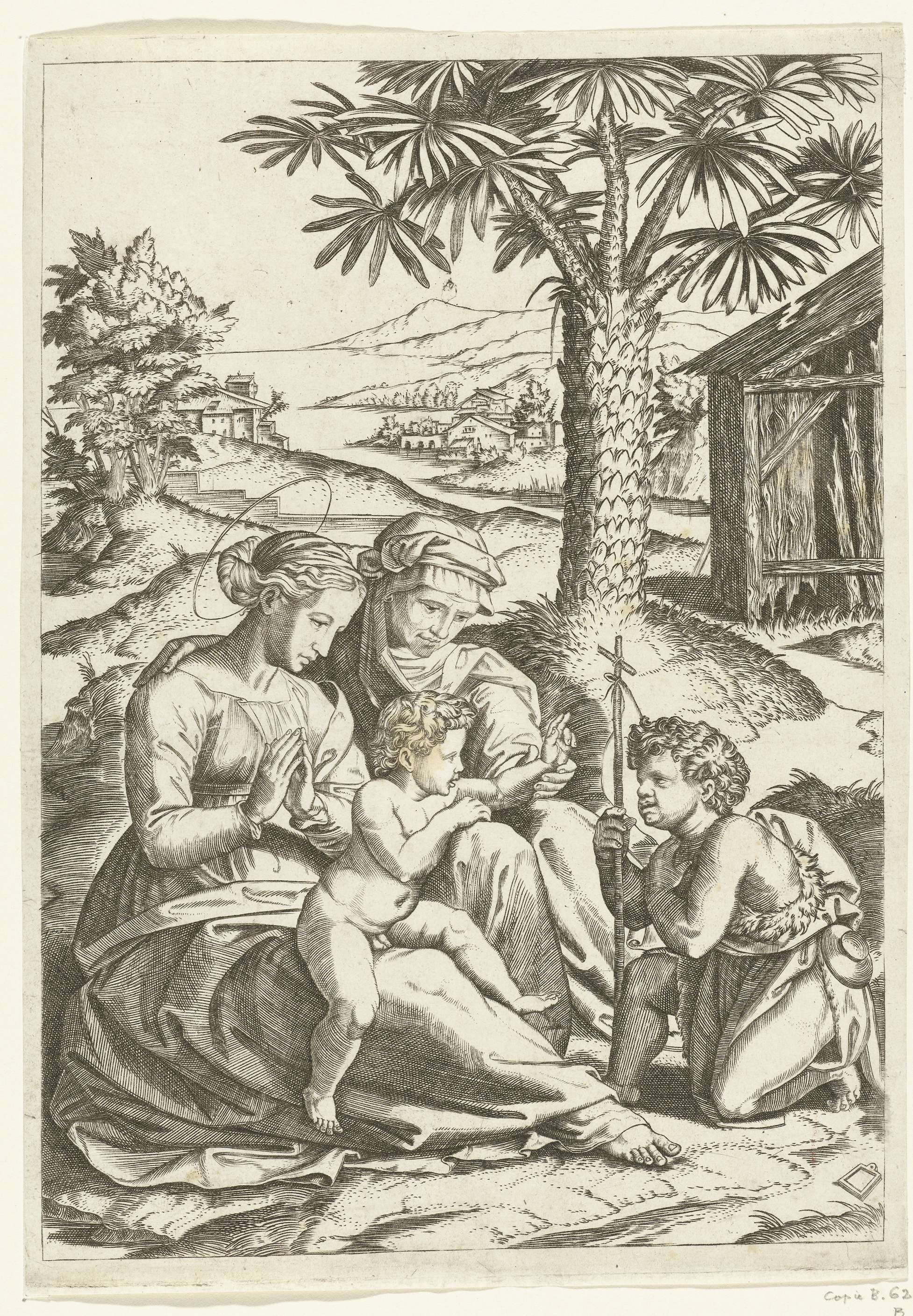 Maria met kind en heilige Elisabet met Johannes de Doper bij palmboom