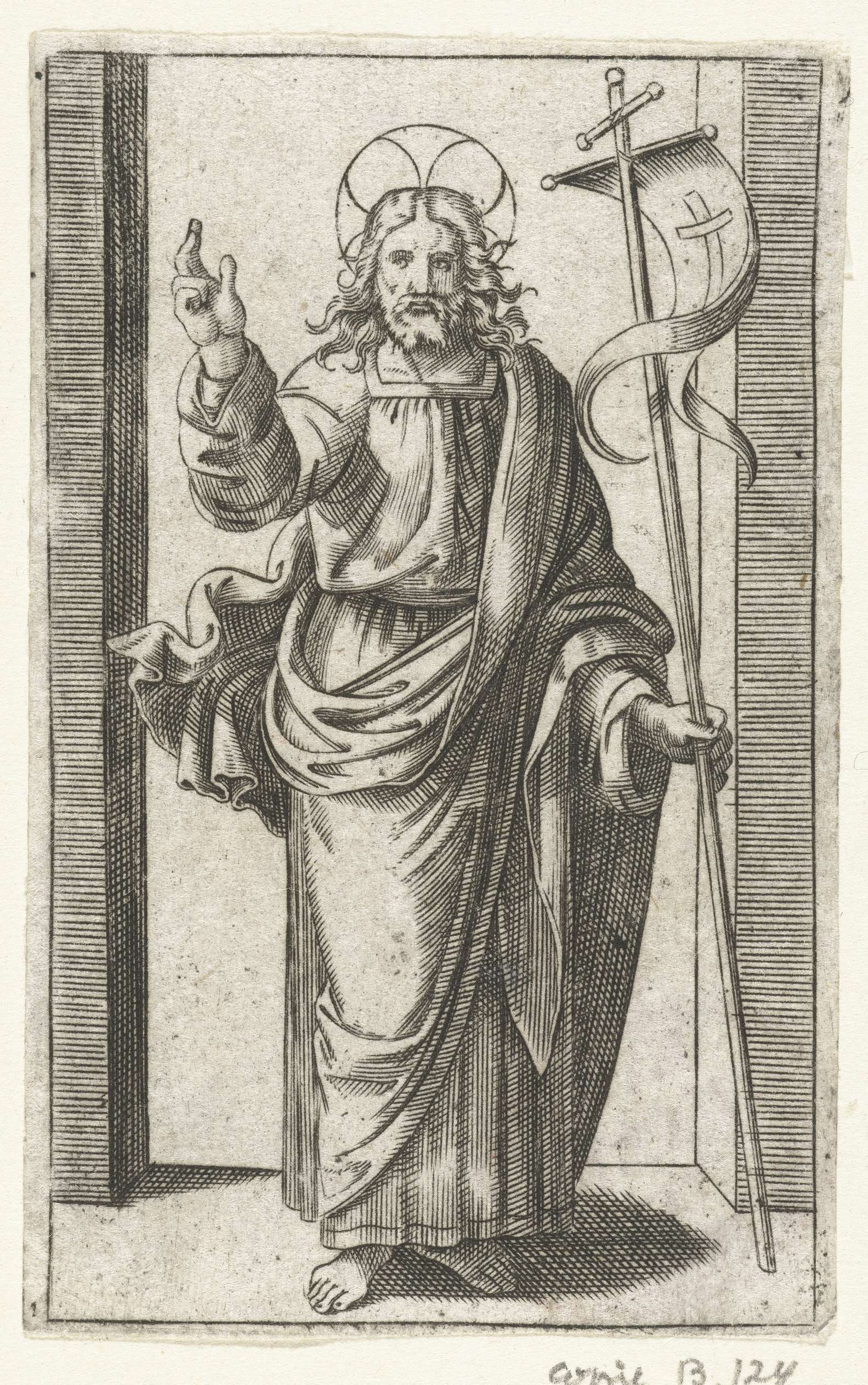 Christus met kruisvaandel maakt zegenend gebaar