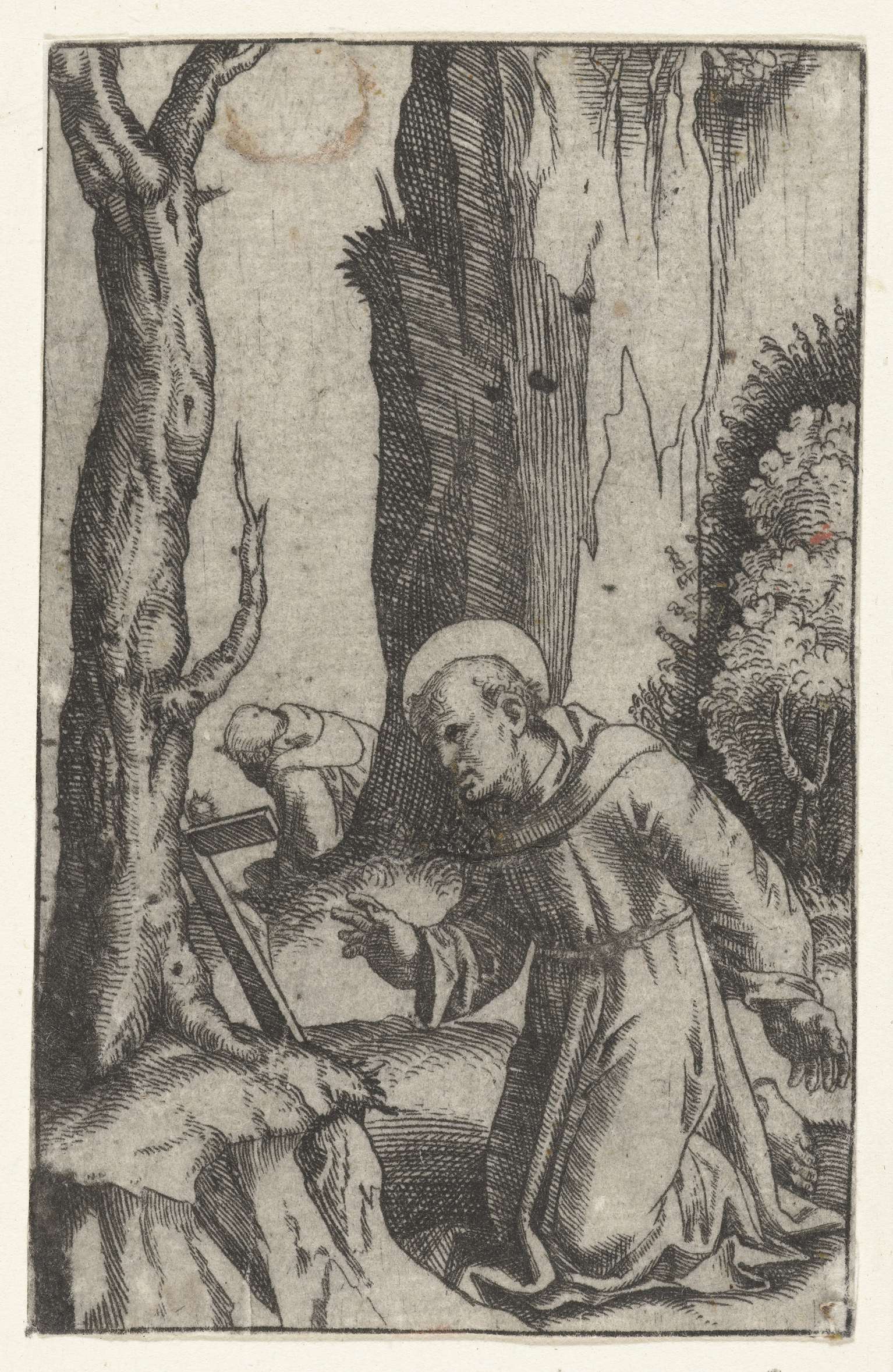 Heilige Franciscus van Assisi knielend voor crucifix