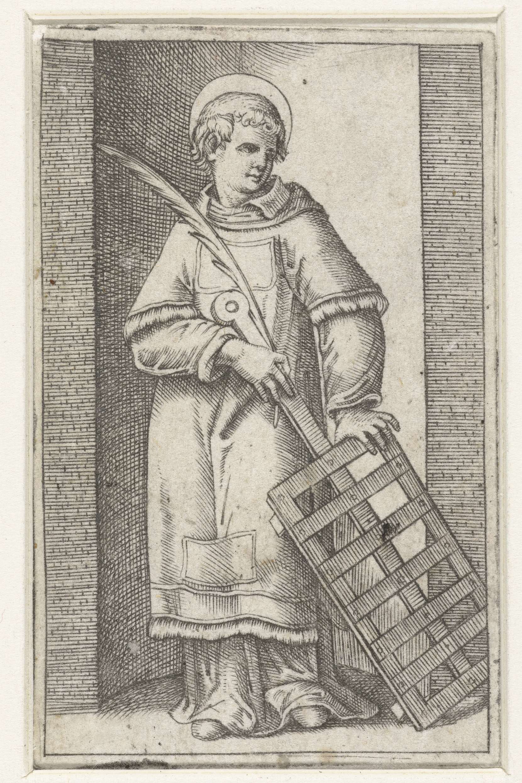 Heilige Laurentius als diaken met rooster staand in nis