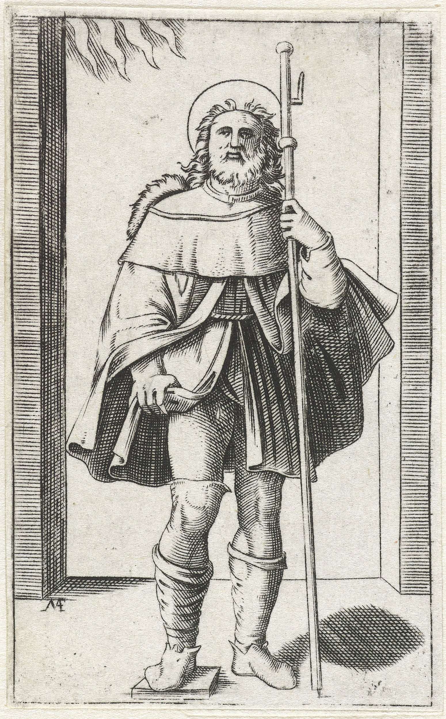 Heilige Rochus als pelgrim met pelgrimsstaf toont pestbult op been