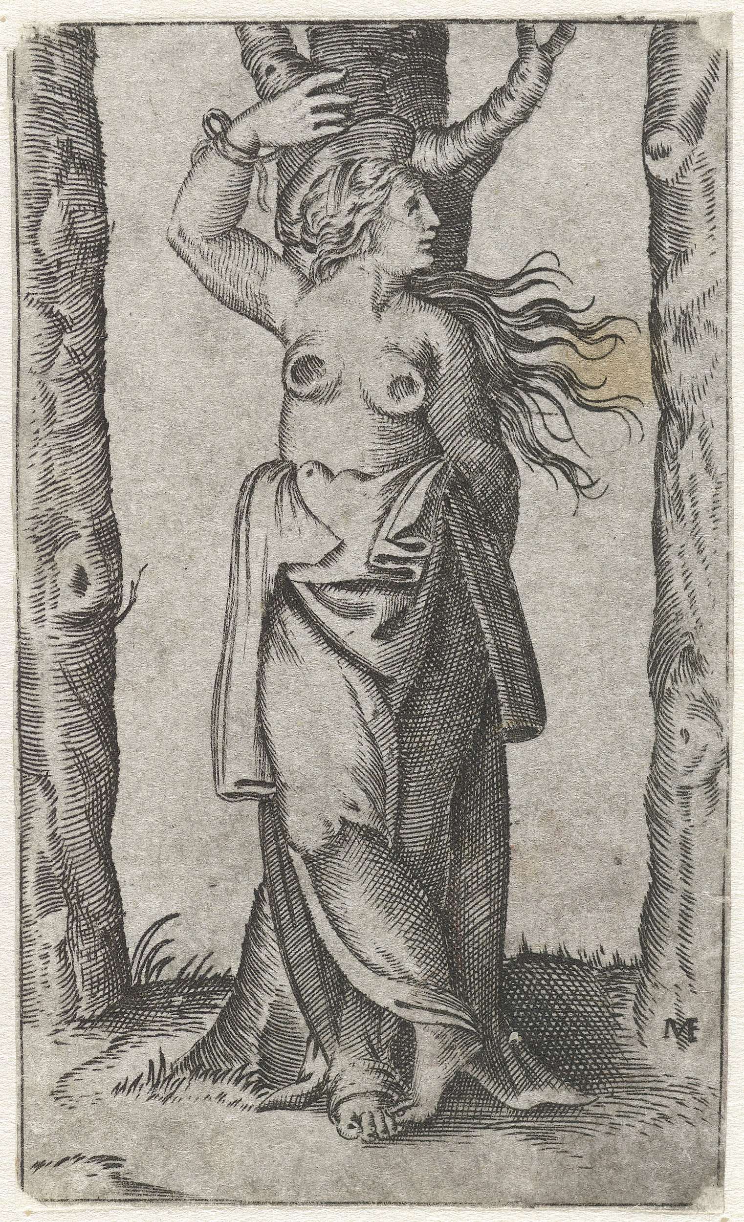 Heilige Agatha vastgebonden aan boom met afgehakte borsten