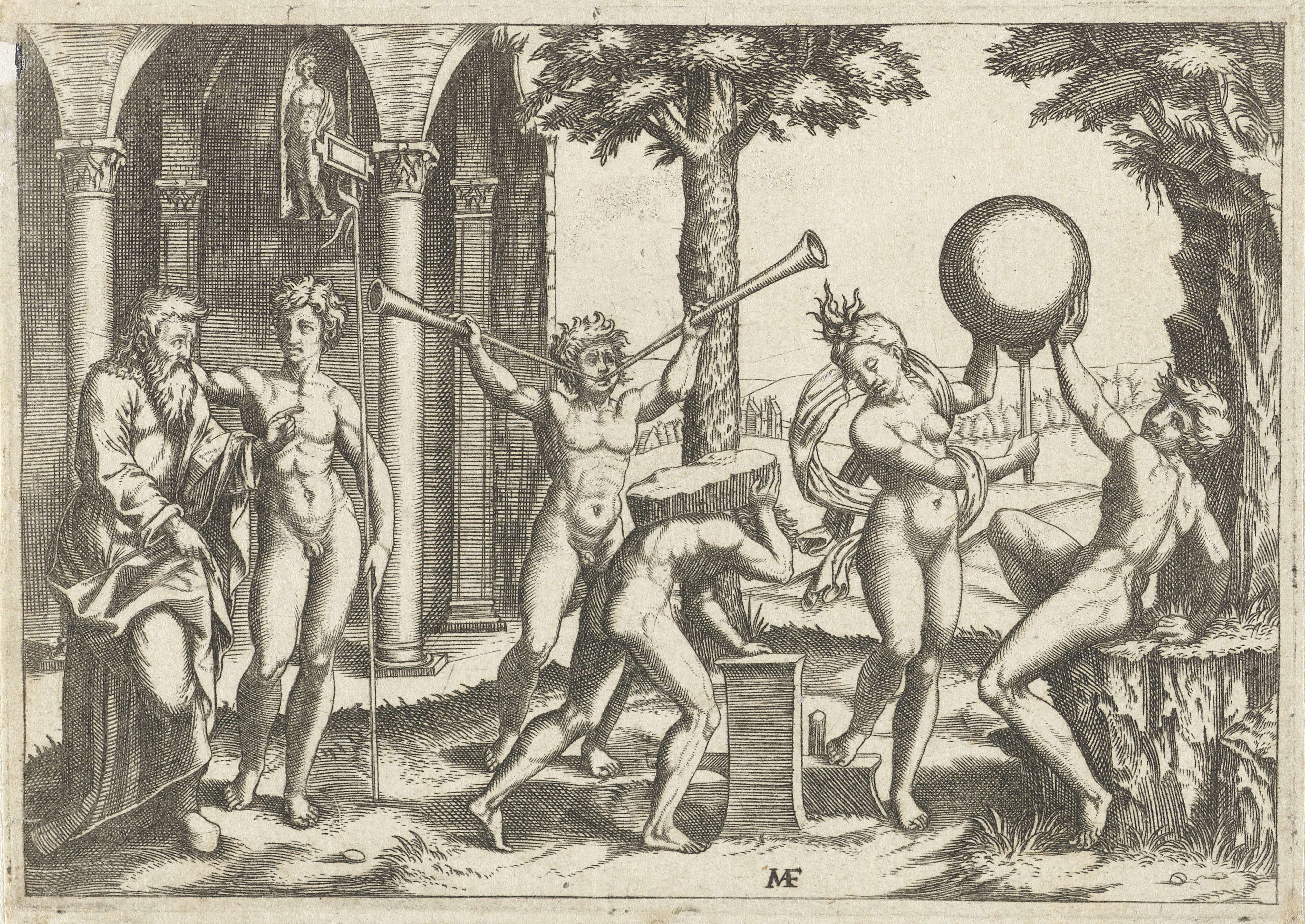 Man met twee trompetten en man met steen op zijn rug geflankeerd door man en vrouw met globe en oude en jonge man