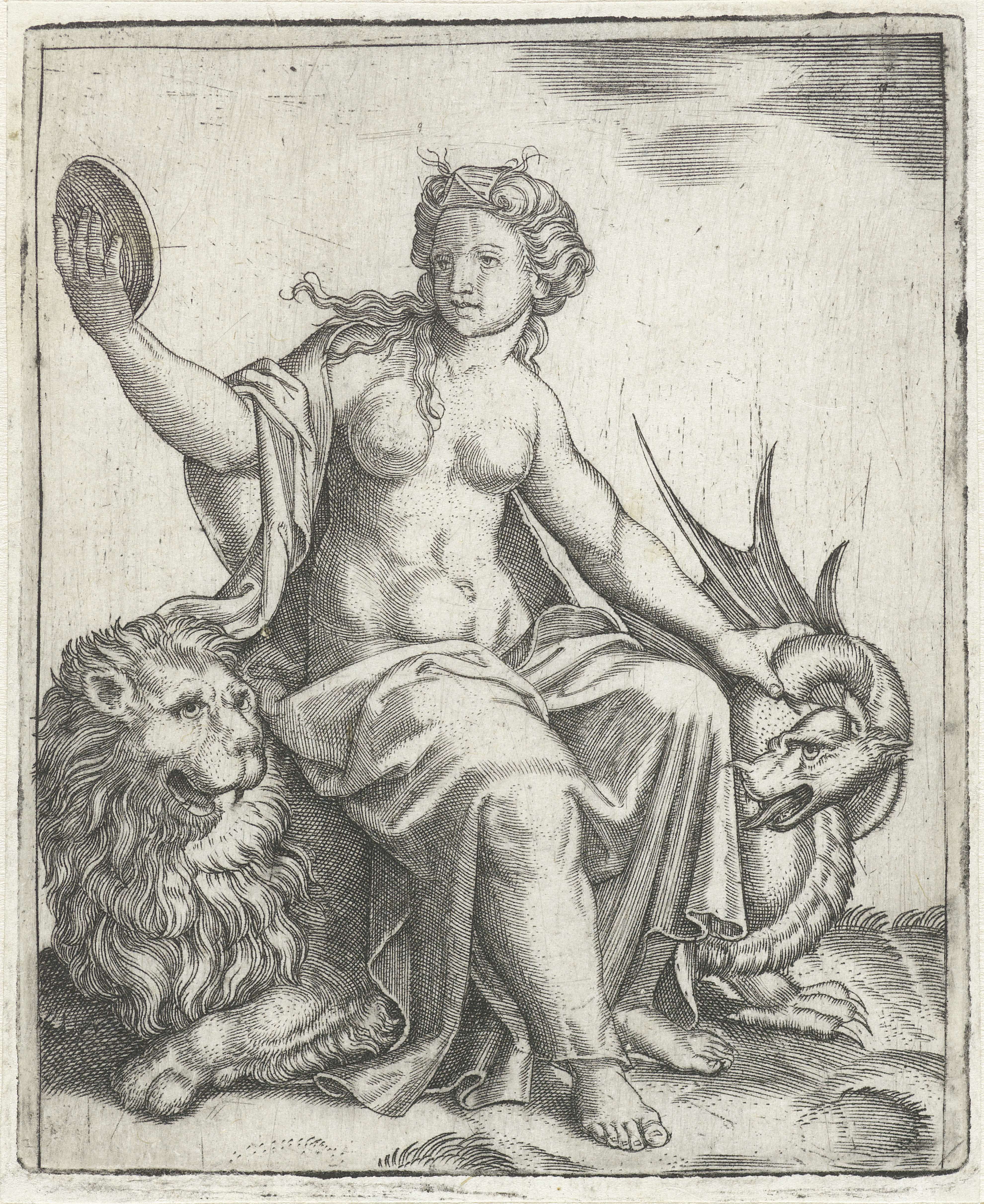 Jonge vrouw als personificatie van de Voorzichtigheid (Prudentia) zittend op de rug van een leeuw terwijl zij in een spiegel kijkt en een draak bij de nek vasthoudt.