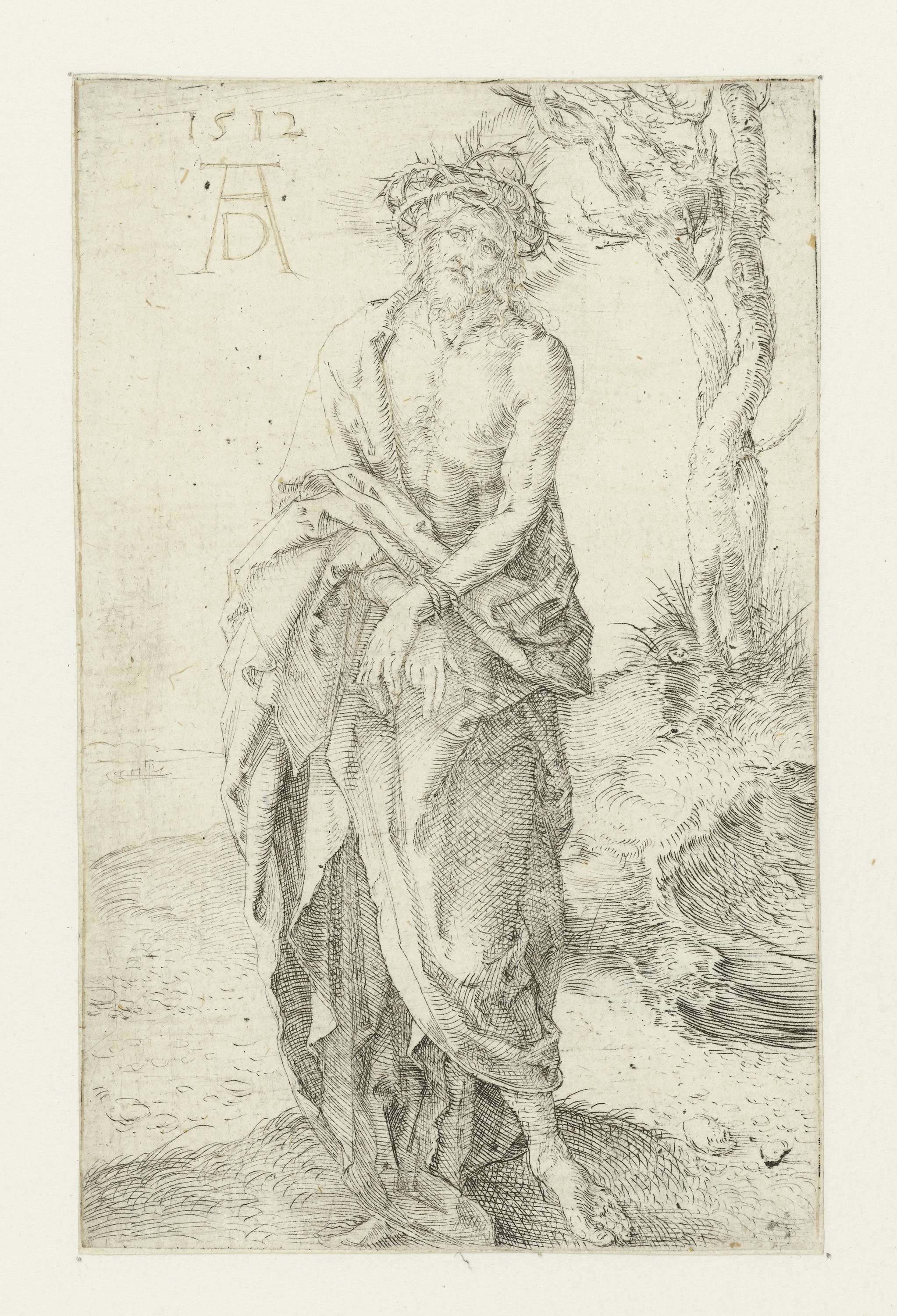 Christus, staand bij een boom, de handen gebonden, een kleed om het lijf en de doornenkroon op het hoofd.