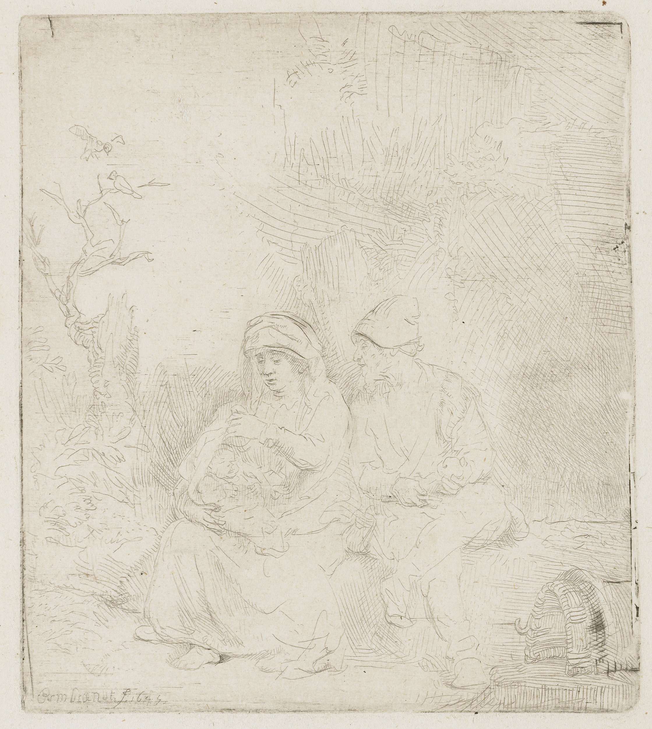 Deze versie valt op doordat Rembrandt de voorstelling vooral in contouren aanduidde en de lijnen opvallend licht uitbeet. Daardoor heeft dit veel weg van een zilverstifttekening. Maria beschut de slapende Jezus tegen de zon, terwijl Jozef vertederd toekijkt en een appeltje schilt. De ezel waarmee ze reizen staat buiten beeld, maar zijn zadel is rechtsvoor ...