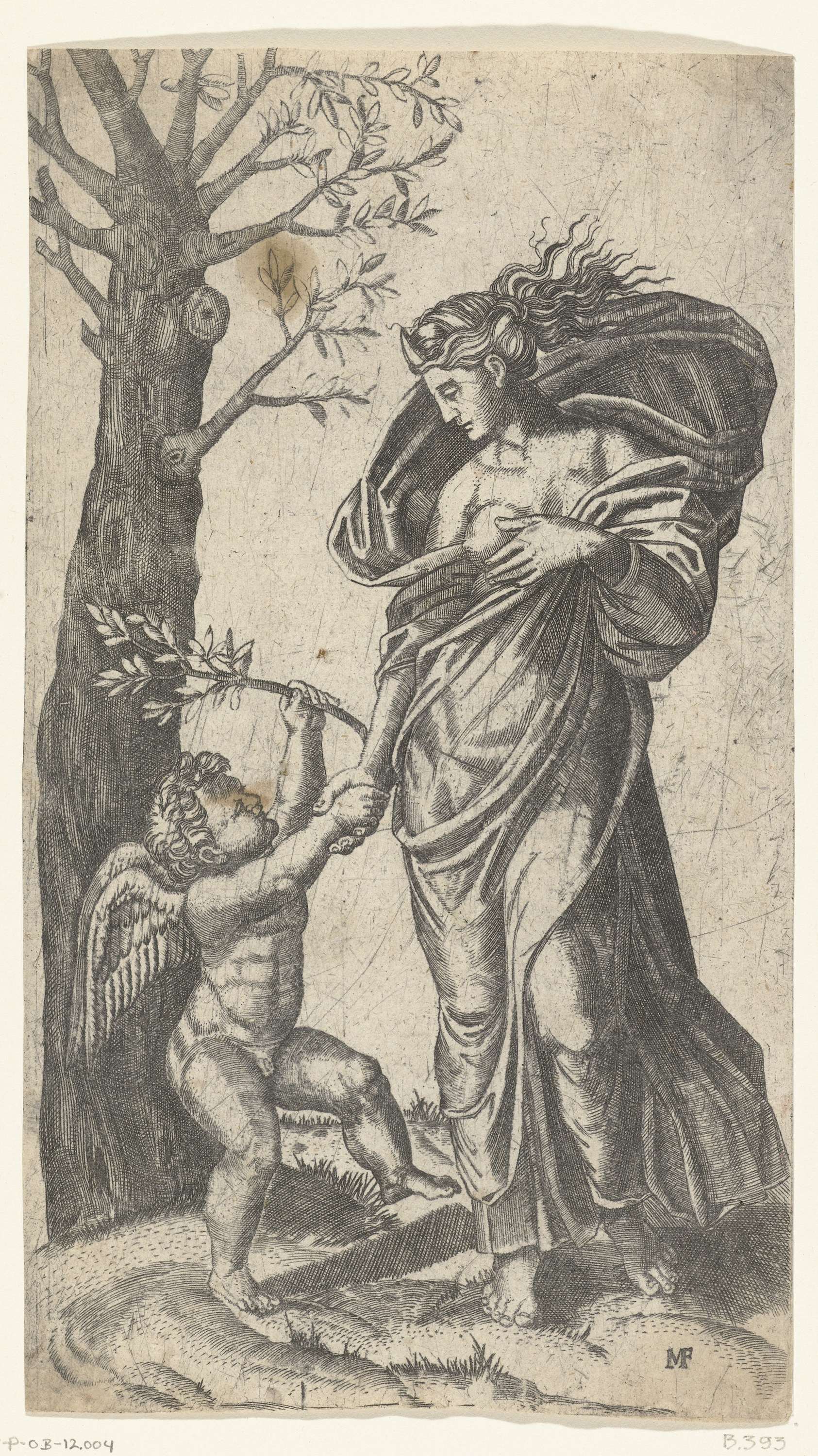 Minerva staand naast olijfboom geeft Amor een hand en krijgt olijftak van hem aangereikt. Zij houdt met haar hand een ontblote borst vast.