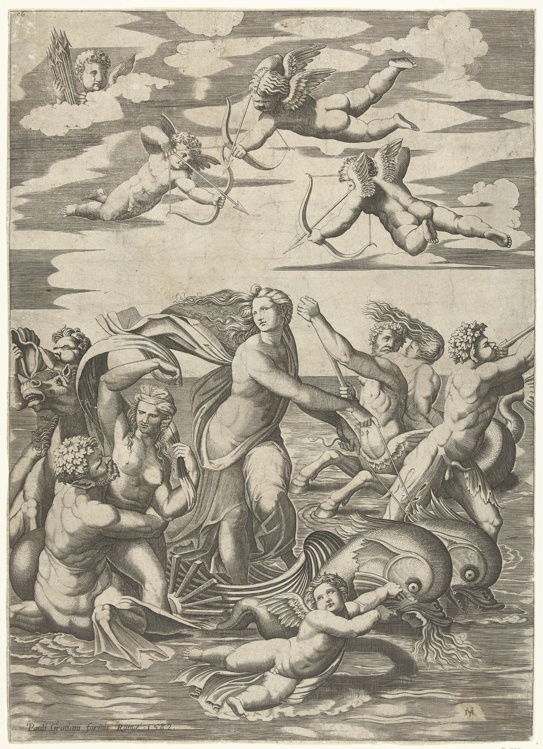 Galatea staat op een schelp en wordt voortgetrokken door dolfijnen. Zij wordt omringd door tritons en nereïden. Drie putti richten hun pijlen op Galatea.
