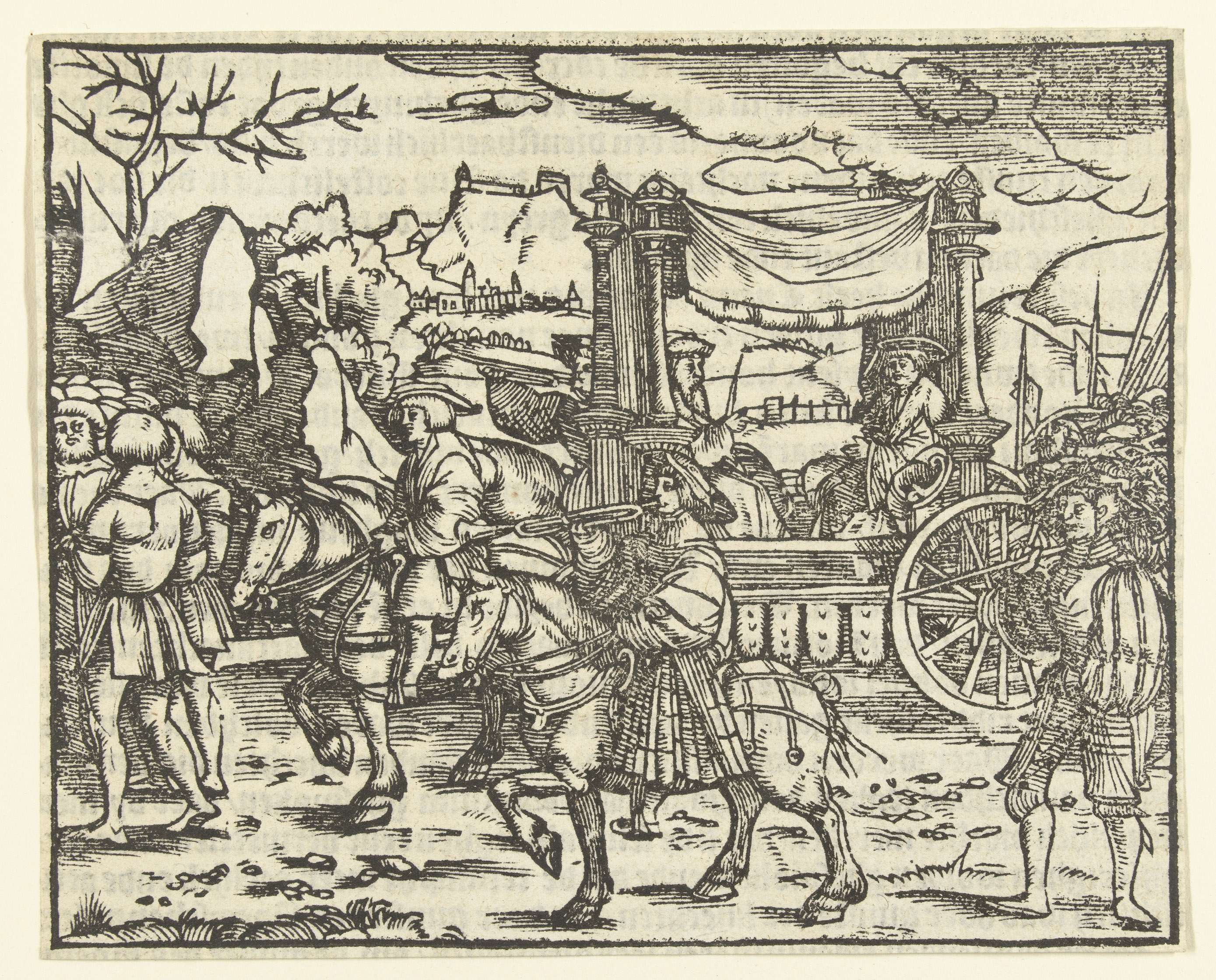 Illustratie uit een boek van Jodocus Damhoudere (?) over de Romeinse historie. Twee mannen in wagen, begeleid door mannen te paard en te voet.