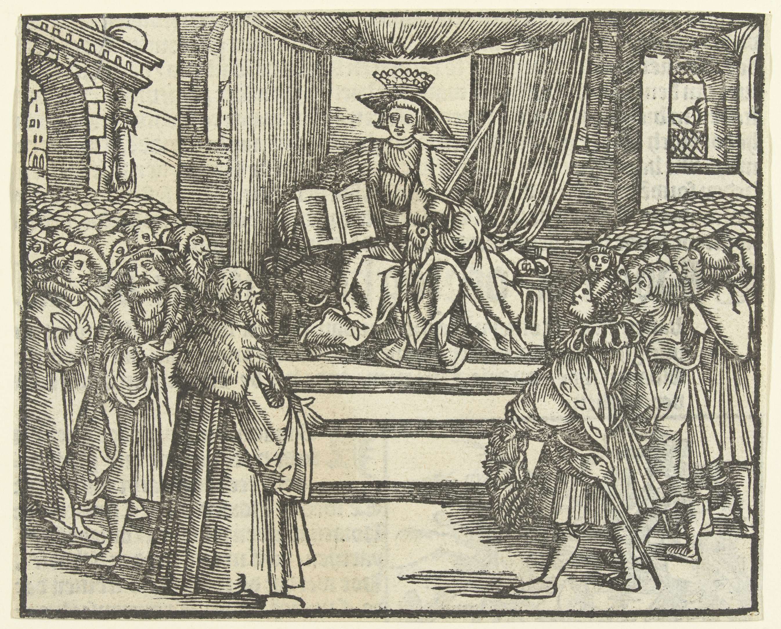 Illustratie uit een boek van Jodocus Damhoudere (?) over de Romeinse historie. Gekroonde vorst op een troon, met boek en zwaard in hand. Grote menigte mensen om hem heen.
