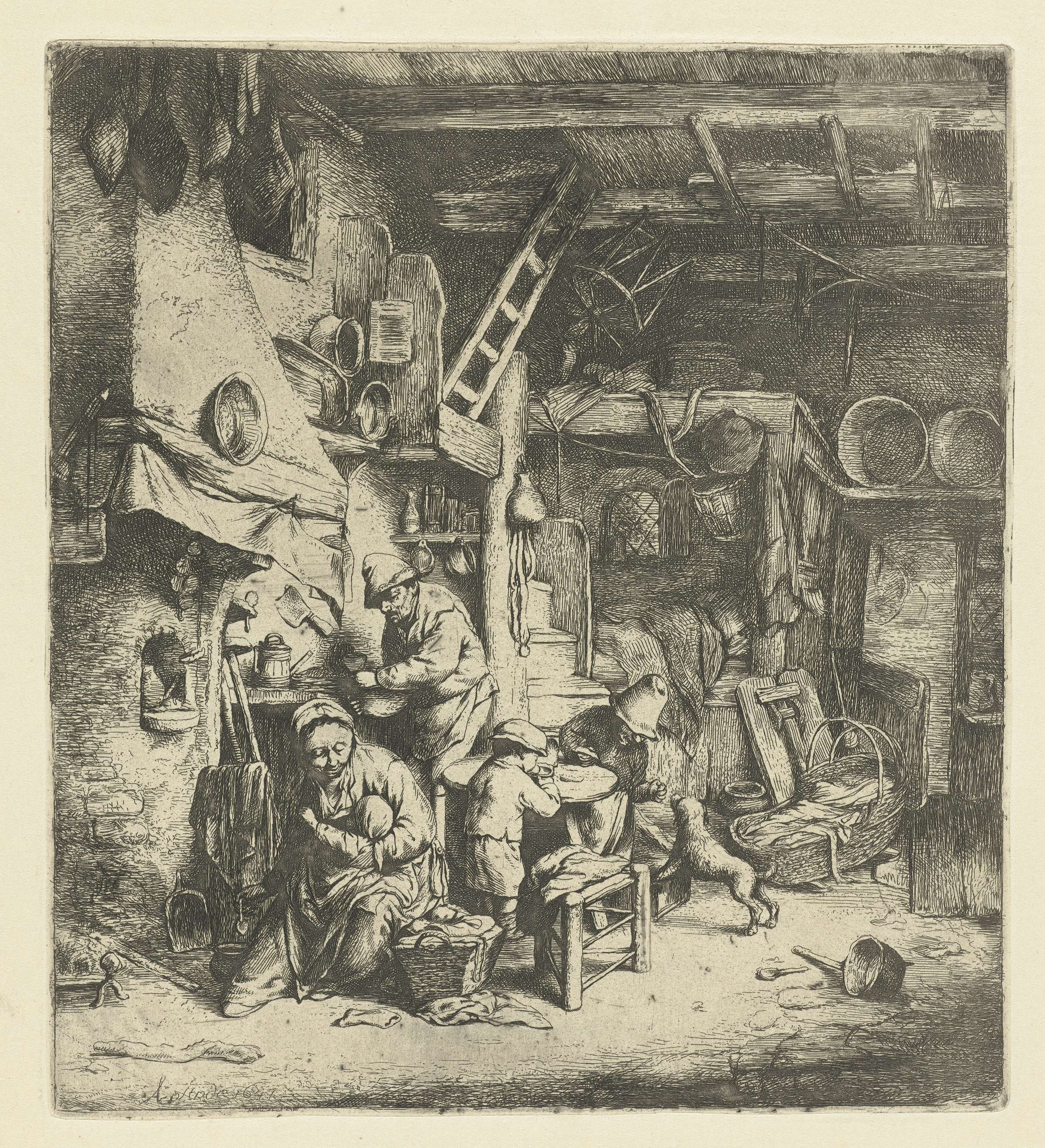 Kopie naar prent van Adriaen van Ostade waarin de originele voorstelling vrij nauwkeurig is gevolgd maar wel spiegelverkeerd is weergegeven.