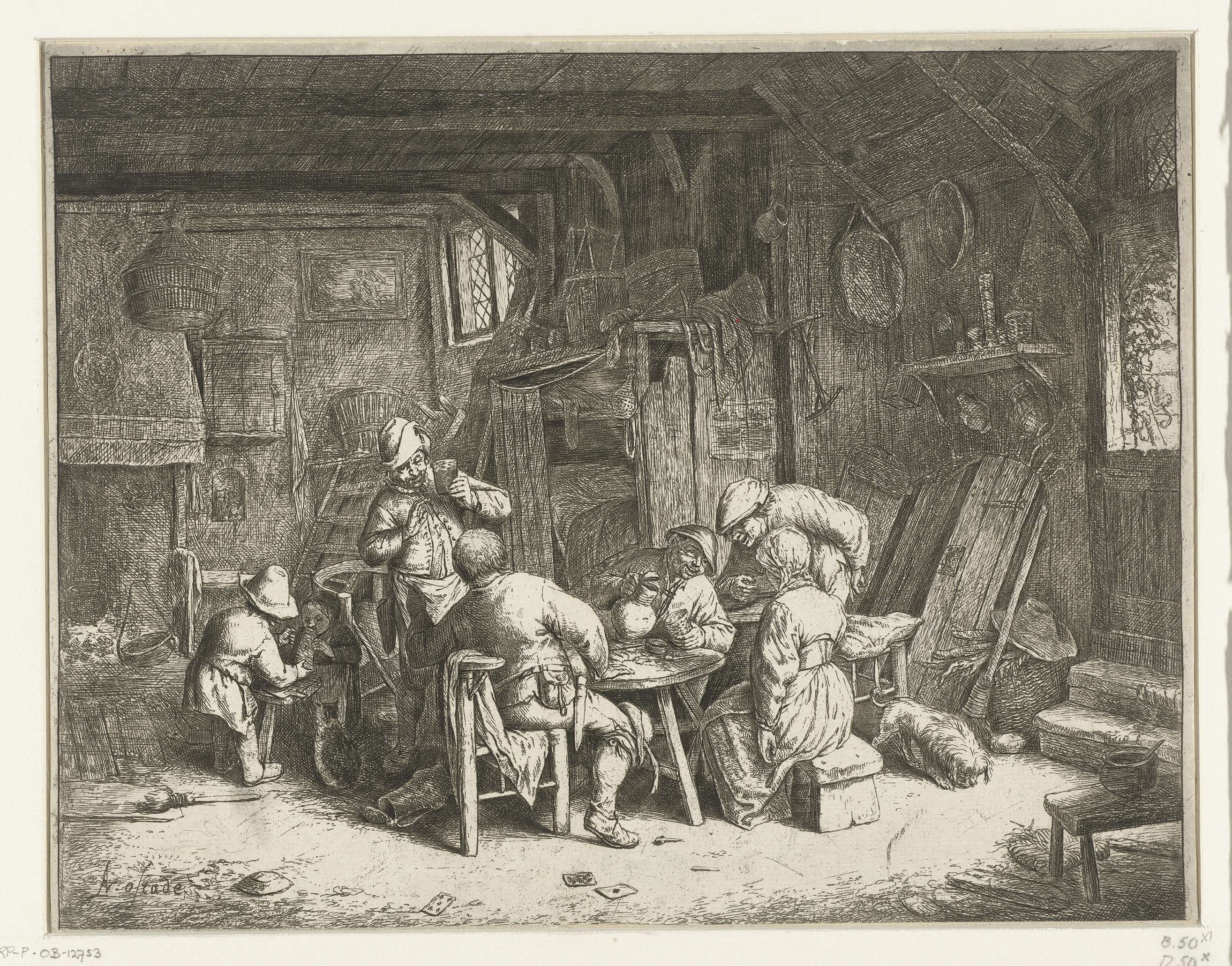 In een rommelig vertrek in een herberg, gebruiken vier mannen en een vrouw een maaltijd. De drank vloeit rijkelijk en de mannen roken pijp. Een jongen helpt een klein kind met drinken uit een kruik. Op de grond liggen speelkaarten, een gebroken pijp en een lege kan. Oorspronkelijk stond onder deze voorstelling een Latijns vers ...