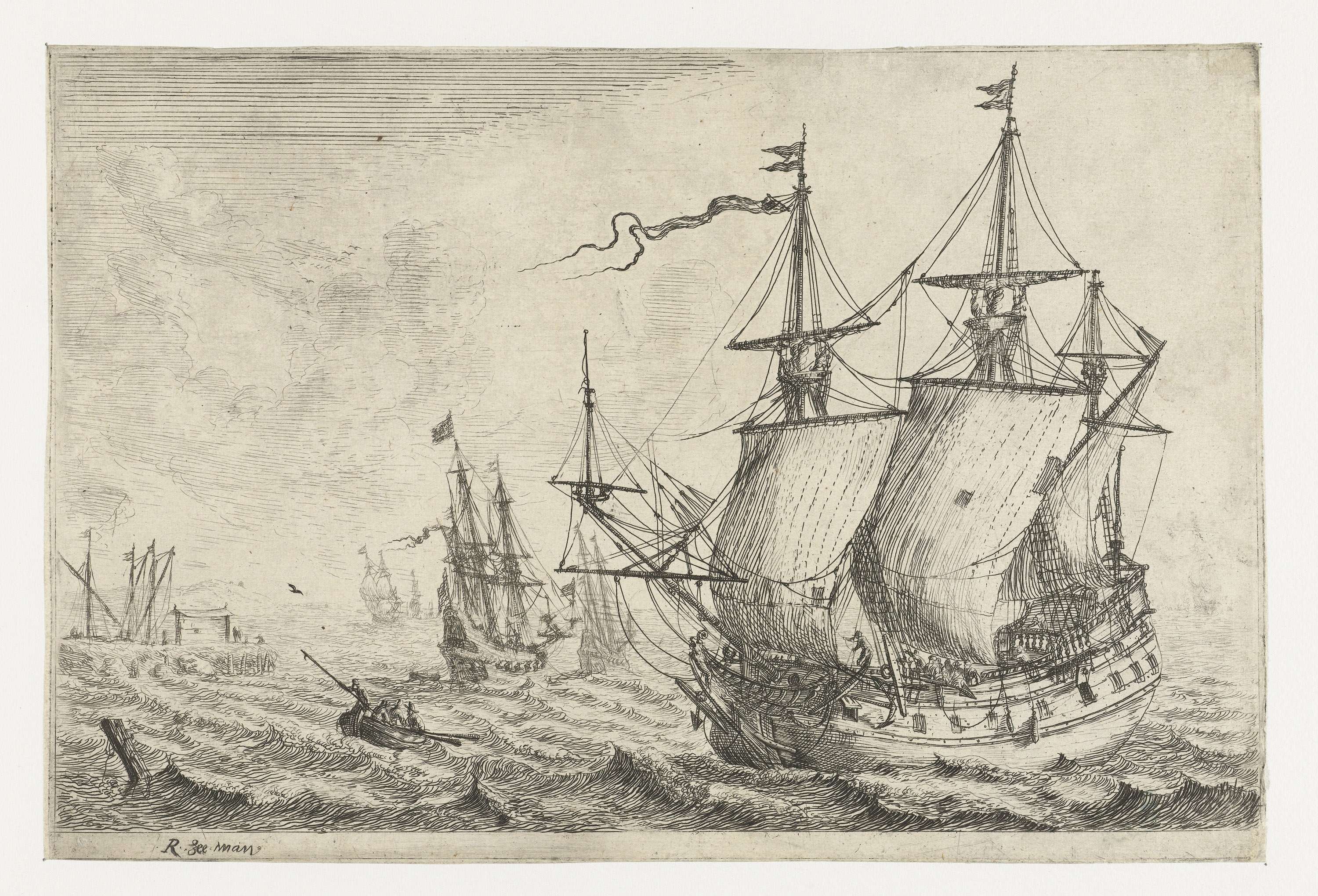 Verschillende grote zeilschepen en een roeiboot in de buurt van een werf.