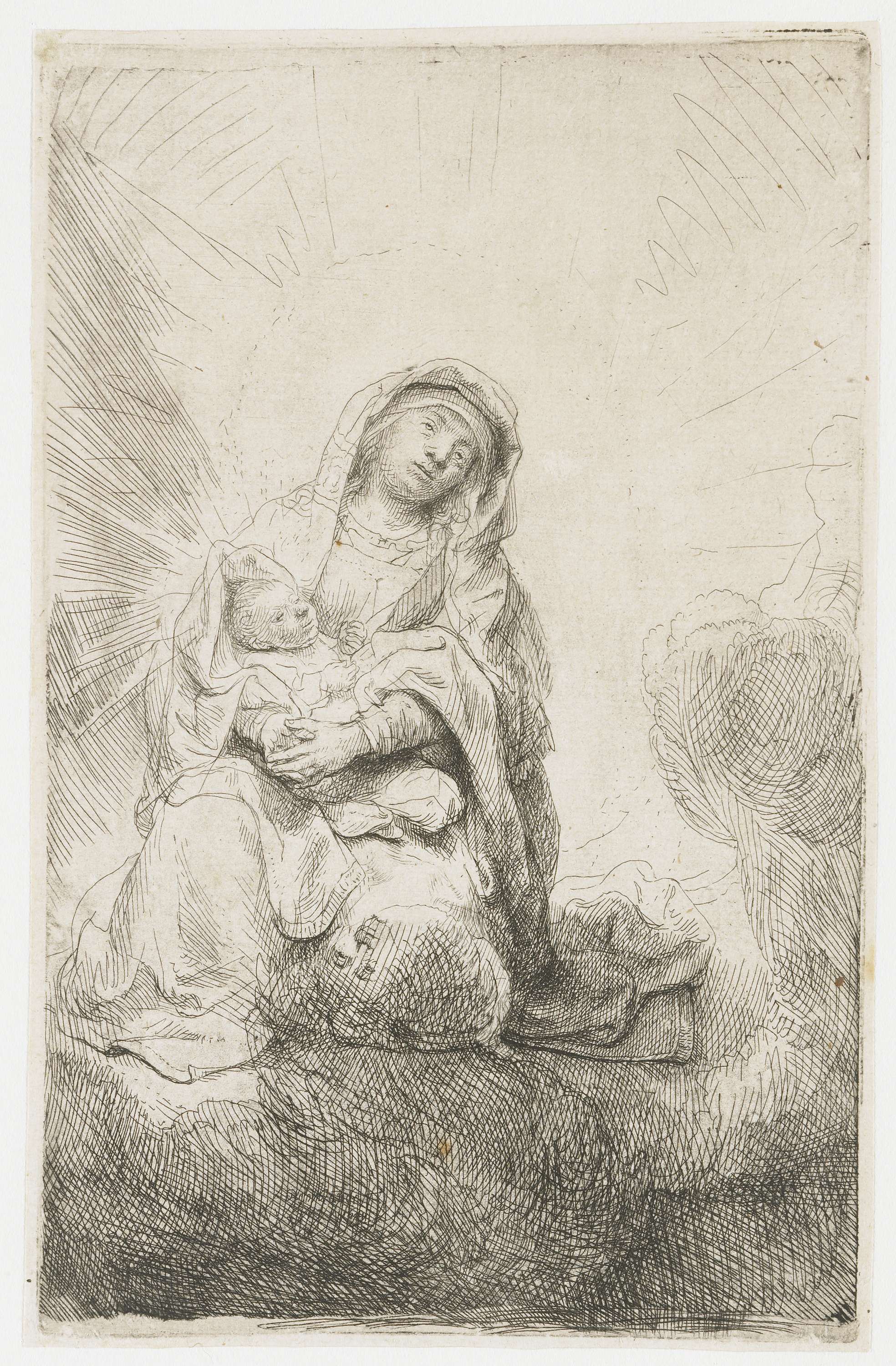 Rembrandt maakte niet alleen prenten, hij verzamelde ze ook op grote schaal. Zijn collectie omvatte talrijke werken van Nederlandse, Franse, Duitse en Italiaanse meesters. Met deze Madonna in de wolken reageert hij op een beroemde ets van de Italiaan Federico Barocci, ongetwijfeld in zijn bezit. Het extra gezicht op de linkerknie van Maria is een ...