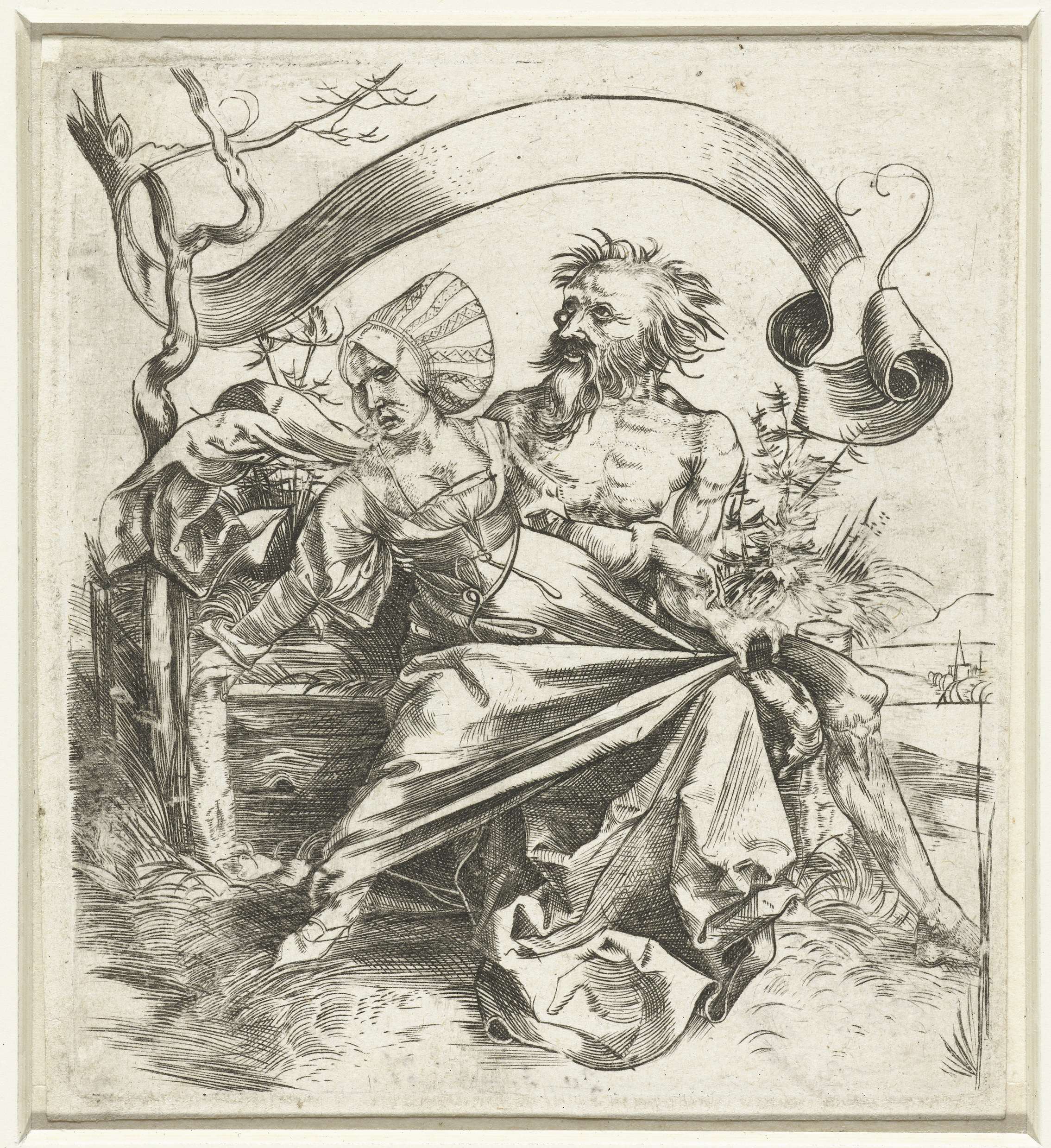 Een jonge vrouw zit op een bank naast een blote man met wilde haren. Hij probeert haar te overweldigen, zij weert hem boos af.