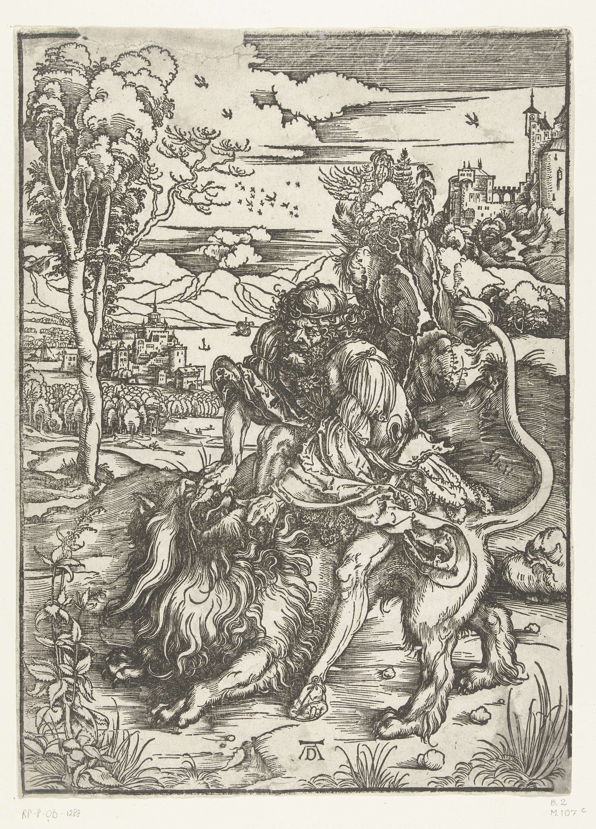 Simson zit op de rug van een leeuw en duwt met zijn blote handen de kaken van het dier uiteen. Op de achtergrond links en rechts een burcht.
