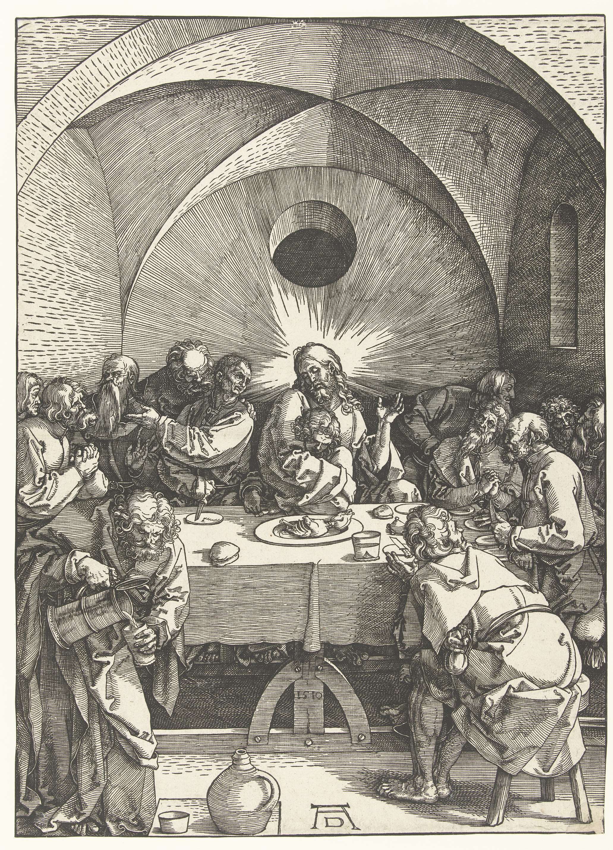 Johannes vleit zich aan de borst van Christus tijdens het Laatste Avondmaal. Deze prent is onderdeel van de prentserie 'De grote Passie', bestaande uit een titelprent en 11 scènes uit het Lijdensverhaal.