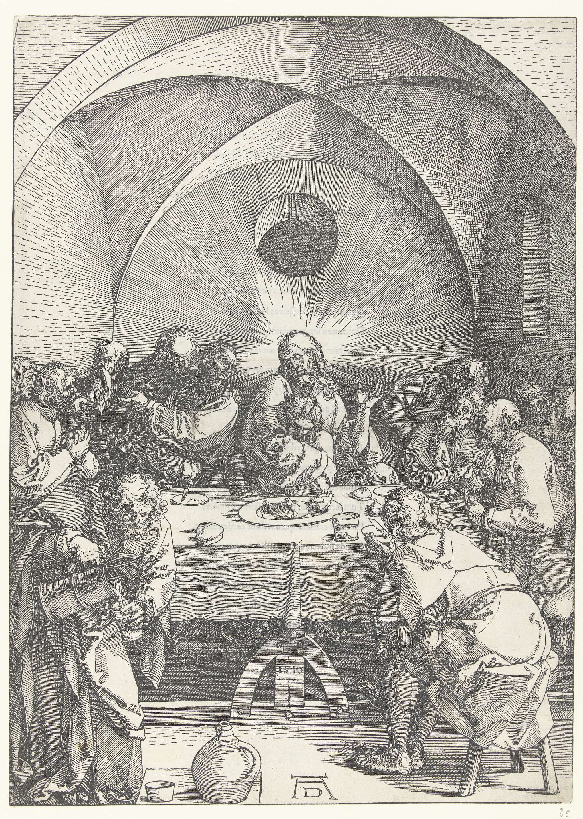 Johannes vleit zich aan de borst van Christus tijdens het Laatste Avondmaal. Op versozijde gedrukte Latijnse tekst. Deze prent is onderdeel van de prentserie 'De grote Passie', bestaande uit een titelprent en 11 scènes uit het Lijdensverhaal.