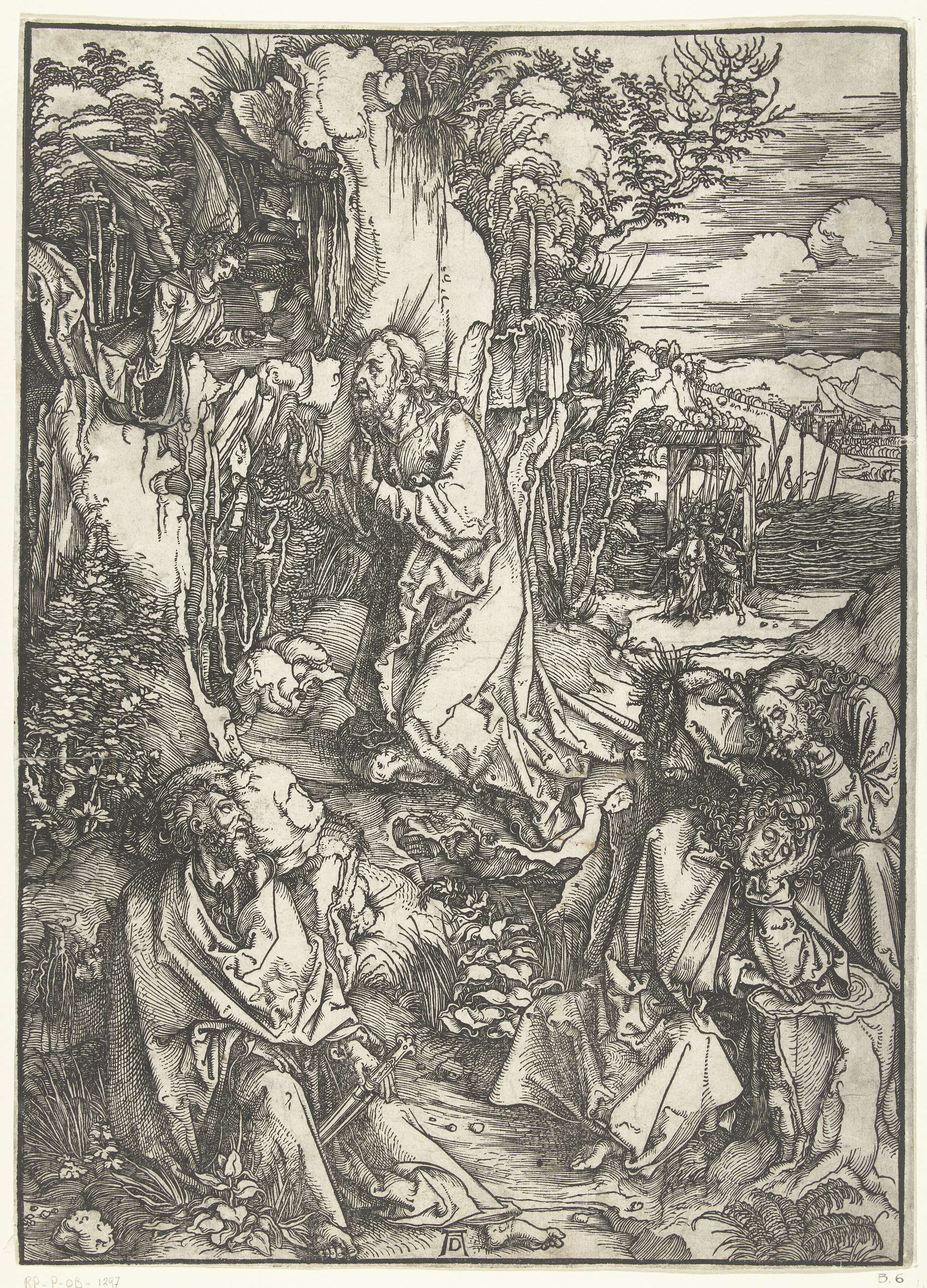 Christus bidt in de Hof van Getsemane, terwijl zijn discipelen om hem heen liggen te slapen. Deze prent is onderdeel van de prentserie 'De grote Passie', bestaande uit een titelprent en 11 scènes uit het Lijdensverhaal.