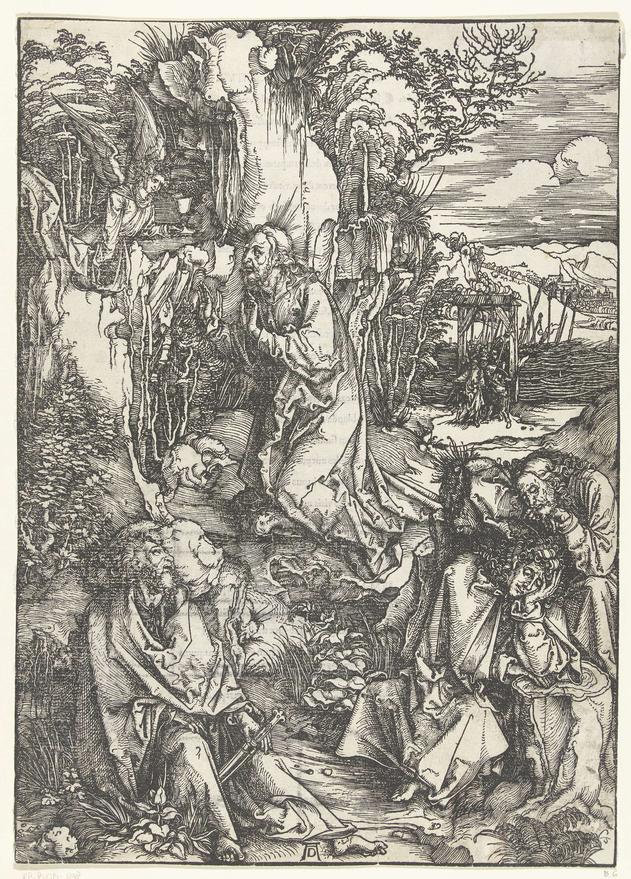 Christus bidt in de Hof van Getsemane, terwijl zijn discipelen om hem heen liggen te slapen. Op versozijde gedrukte Latijnse tekst. Deze prent is onderdeel van de prentserie 'De grote Passie', bestaande uit een titelprent en 11 scènes uit het Lijdensverhaal.