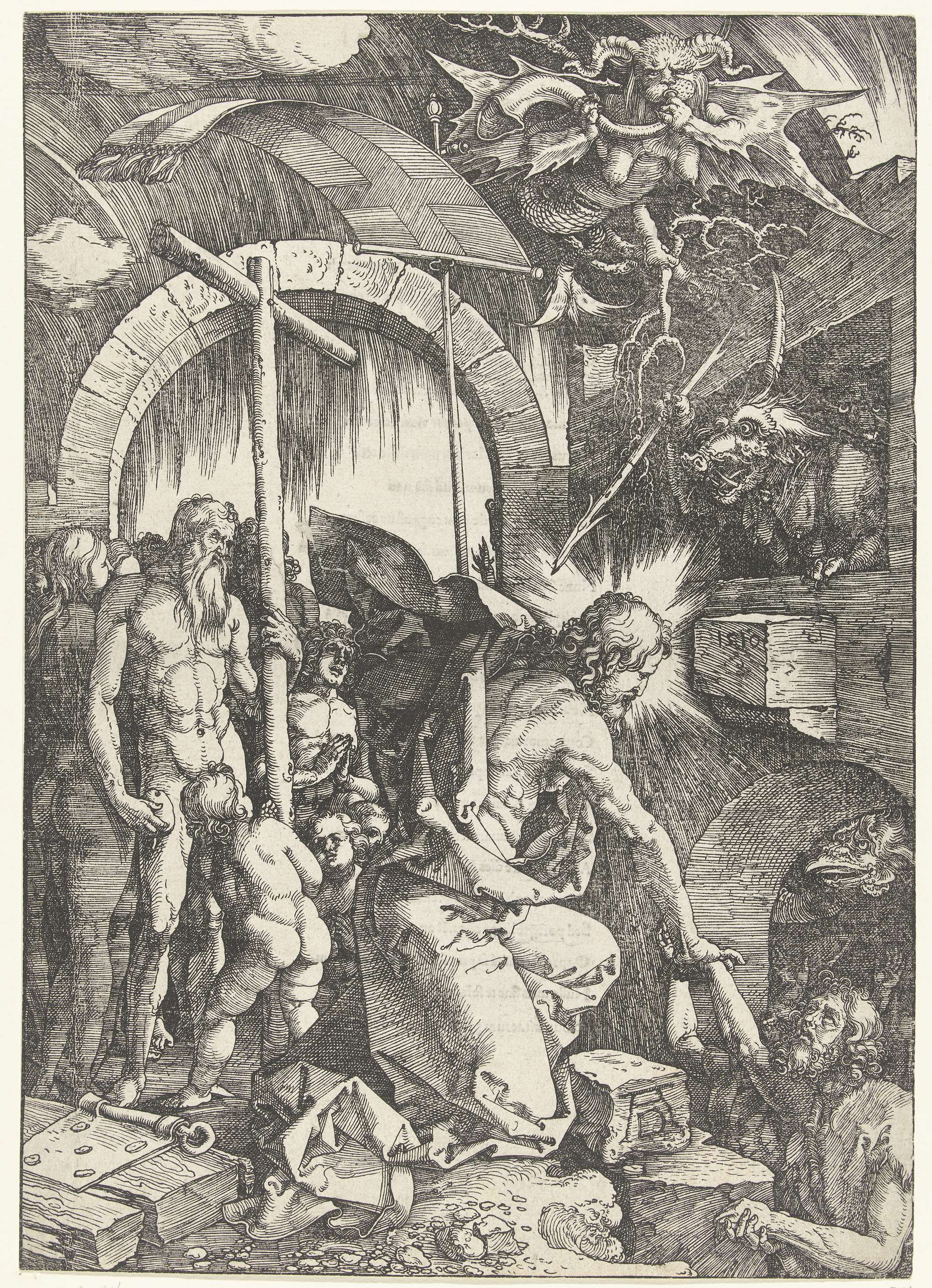 Christus, een staf met een vaan in de hand, bevrijdt zielen uit een kerker. Duivelse wezen proberen Christus te hinderen, maar zonder succes. Op versozijde gedrukte Latijnse tekst. Deze prent is onderdeel van de prentserie 'De grote Passie', bestaande uit een titelprent en 11 scènes uit het Lijdensverhaal.