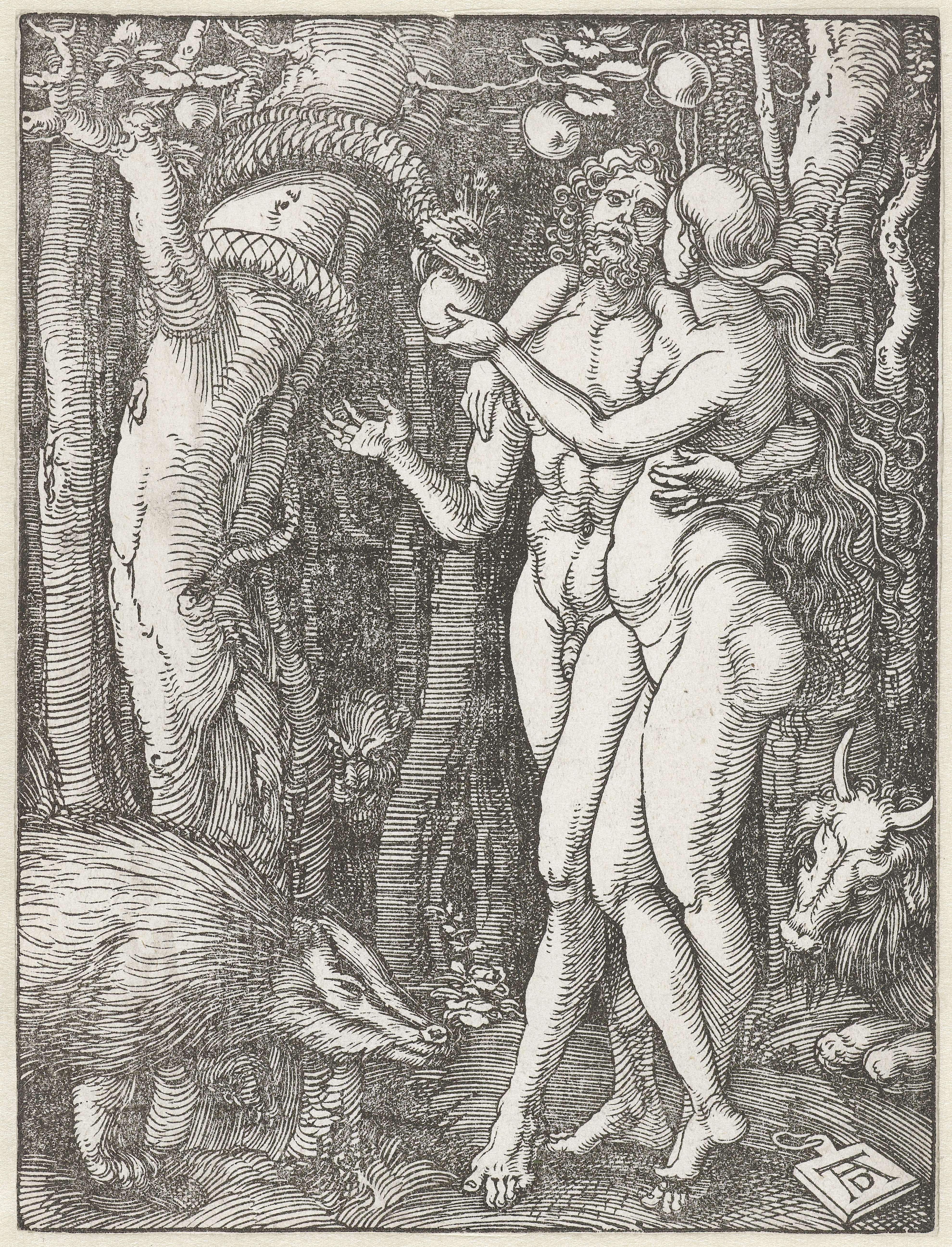 Eva, de arm om de schouders van Adam geslagen, neemt de vrucht van de slang aan. Deze prent is onderdeel van de prentserie 'De kleine Passie', bestaande uit een titelprent en 36 bijbelse scènes (voornamelijk uit het Lijdensverhaal).
