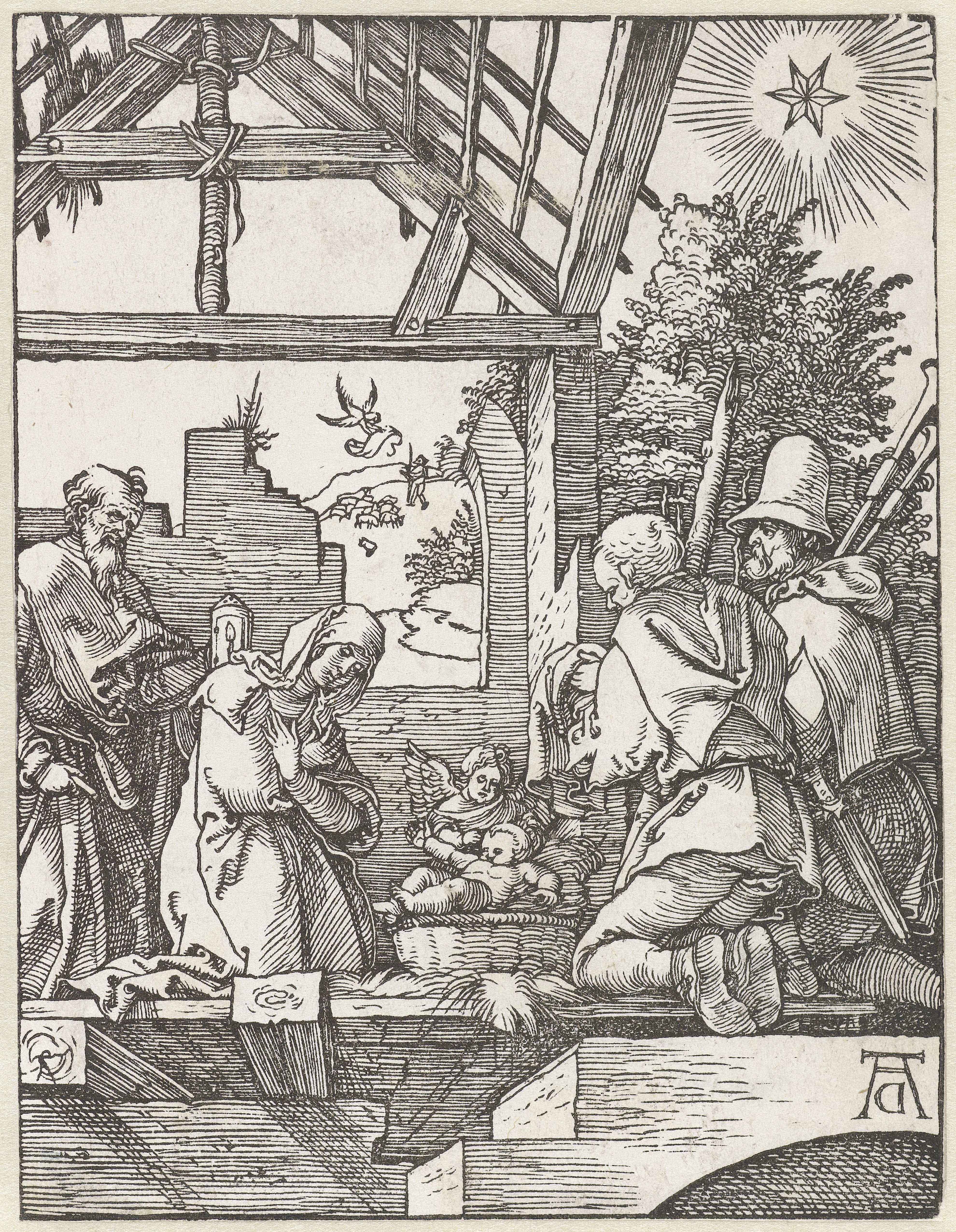 Maria, Jozef en enkele herders aanbidden het Christuskind in een vervallen stal. Op de achtergrond de verkondiging aan de herders op het veld. Deze prent is onderdeel van de prentserie 'De kleine Passie', bestaande uit een titelprent en 36 bijbelse scènes (voornamelijk uit het Lijdensverhaal).