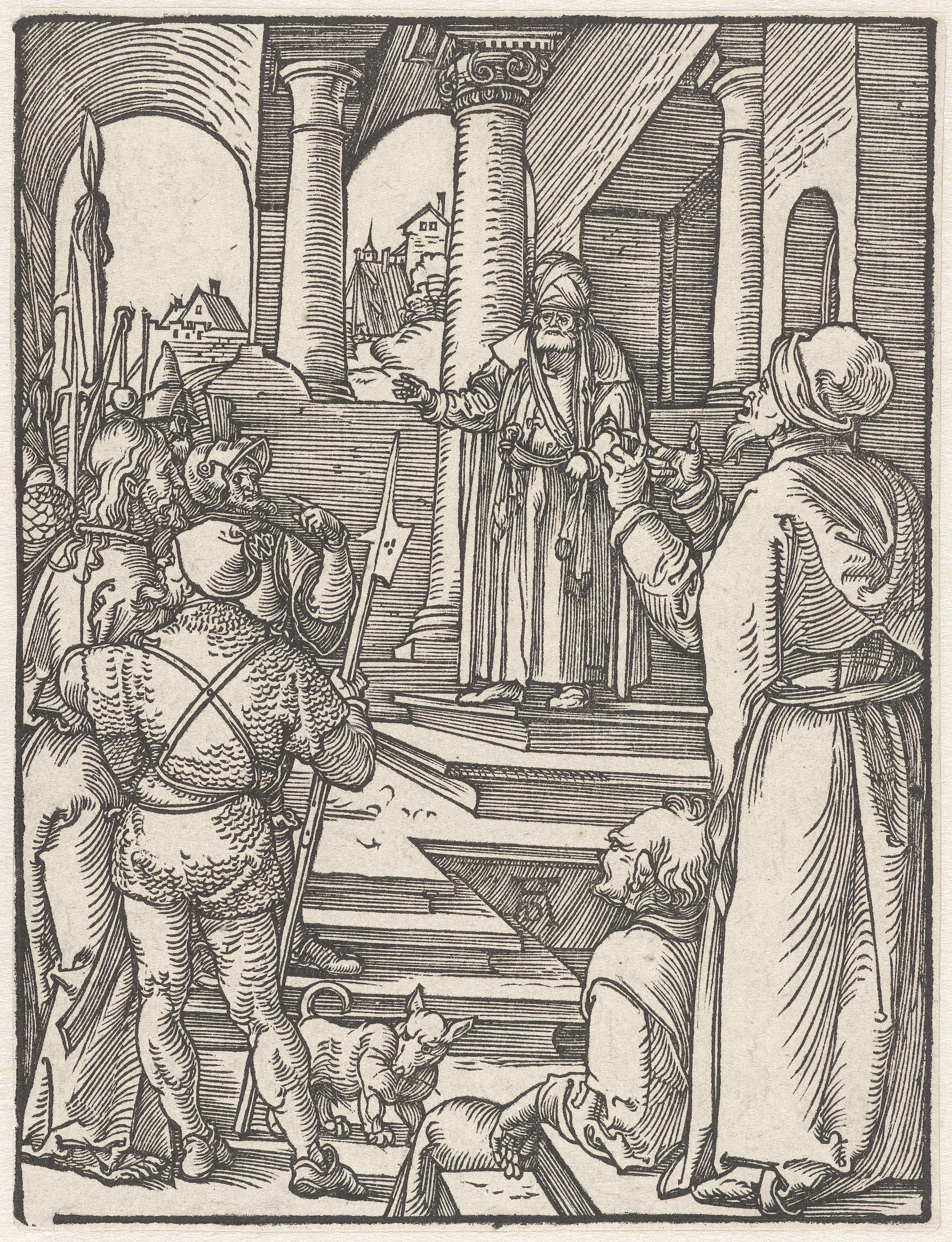 Christus wordt door gewapende mannen voor Pilatus geleid. Deze prent is onderdeel van de prentserie 'De kleine Passie', bestaande uit een titelprent en 36 bijbelse scènes (voornamelijk uit het Lijdensverhaal).