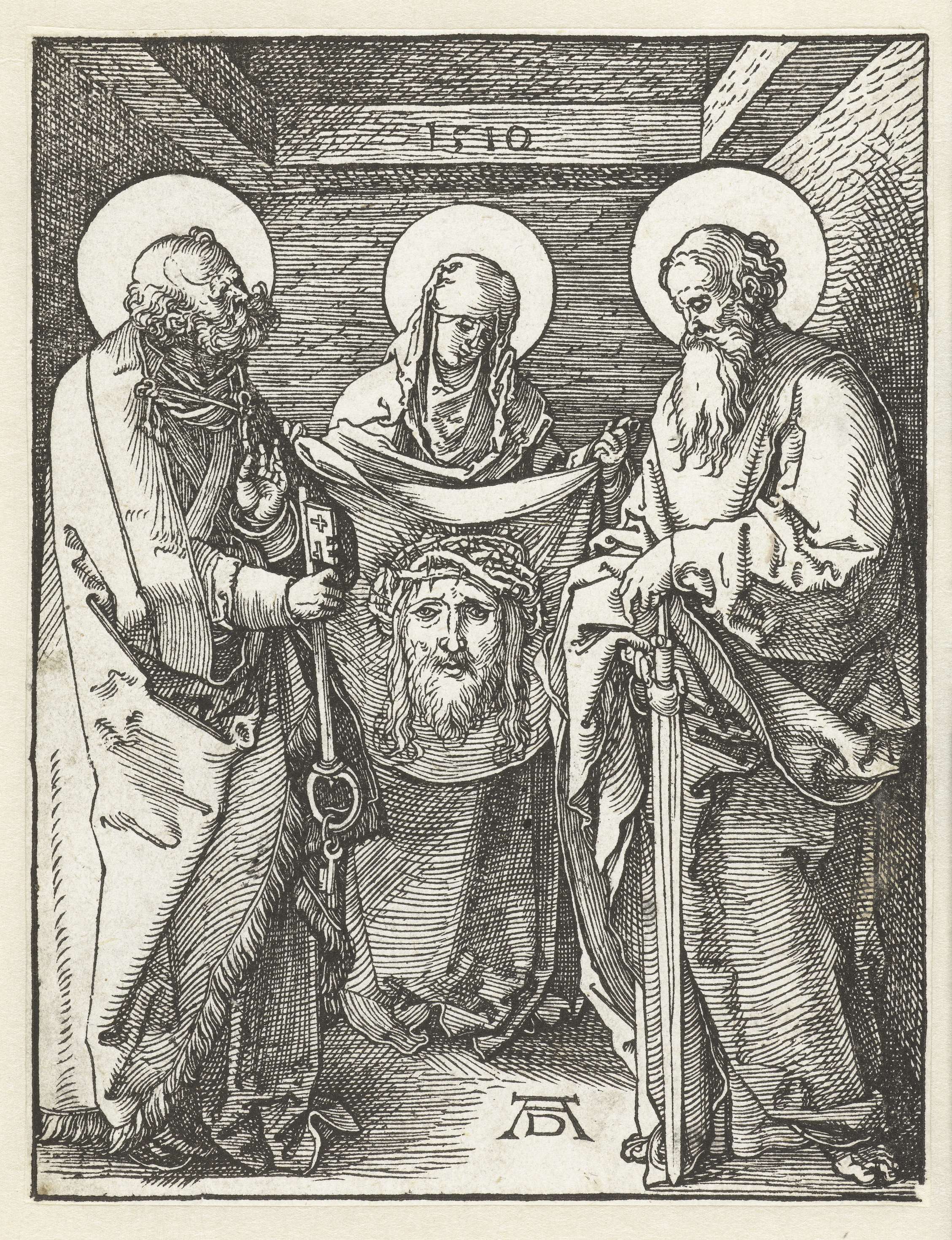 Veronica, geflankeerd door Petrus en Paulus, houdt de zweetdoek met de afdruk van het gelaat van Christus (sudarium) op. Deze prent is onderdeel van de prentserie 'De kleine Passie', bestaande uit een titelprent en 36 bijbelse scènes (voornamelijk uit het Lijdensverhaal).
