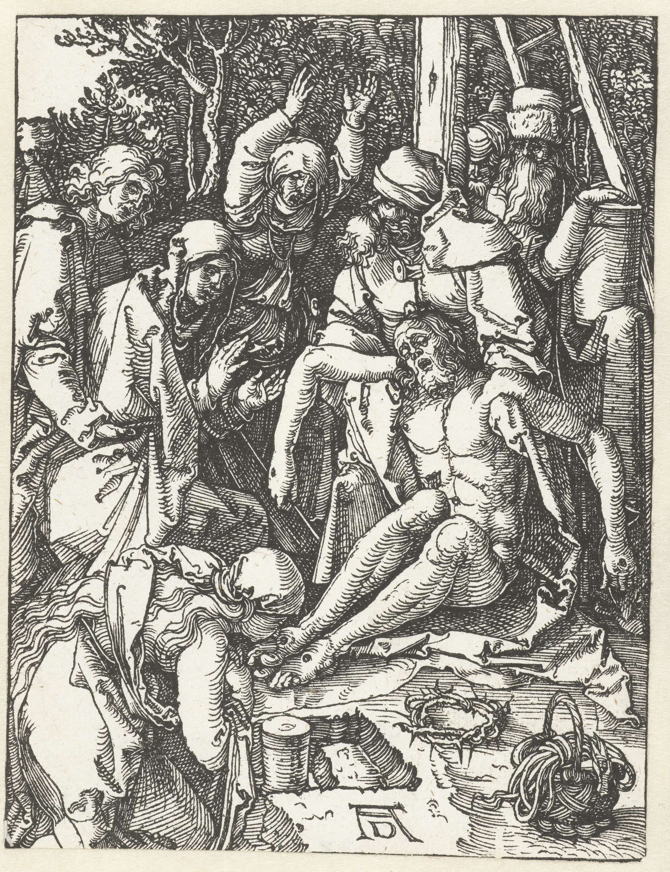 De gestorven Christus wordt door zijn moeder, Maria Magdalena en Johannes de Evangelist beweend. Deze prent is onderdeel van de prentserie 'De kleine Passie', bestaande uit een titelprent en 36 bijbelse scènes (voornamelijk uit het Lijdensverhaal).