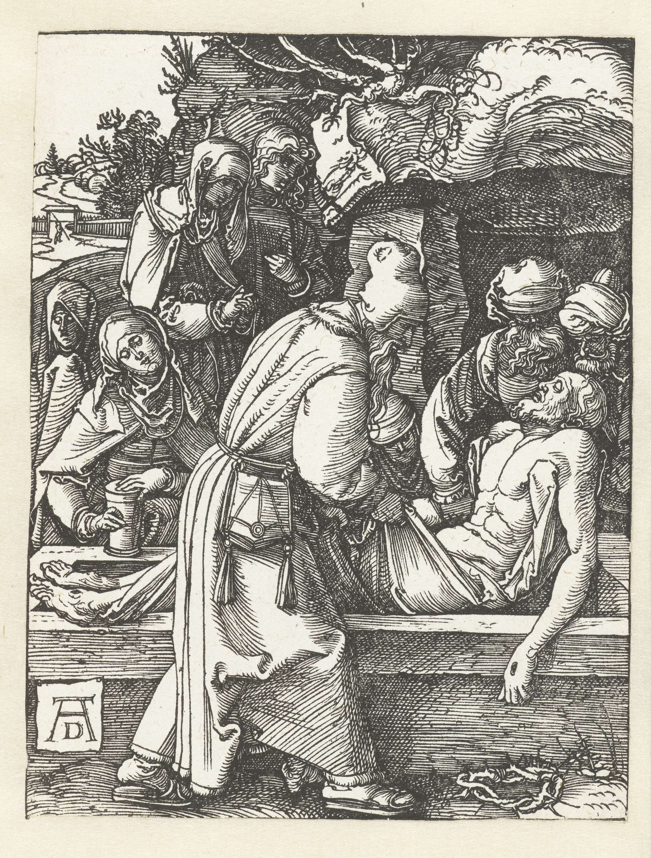 Het lichaam van Christus wordt in een graf gelegd. Deze prent is onderdeel van de prentserie 'De kleine Passie', bestaande uit een titelprent en 36 bijbelse scènes (voornamelijk uit het Lijdensverhaal).