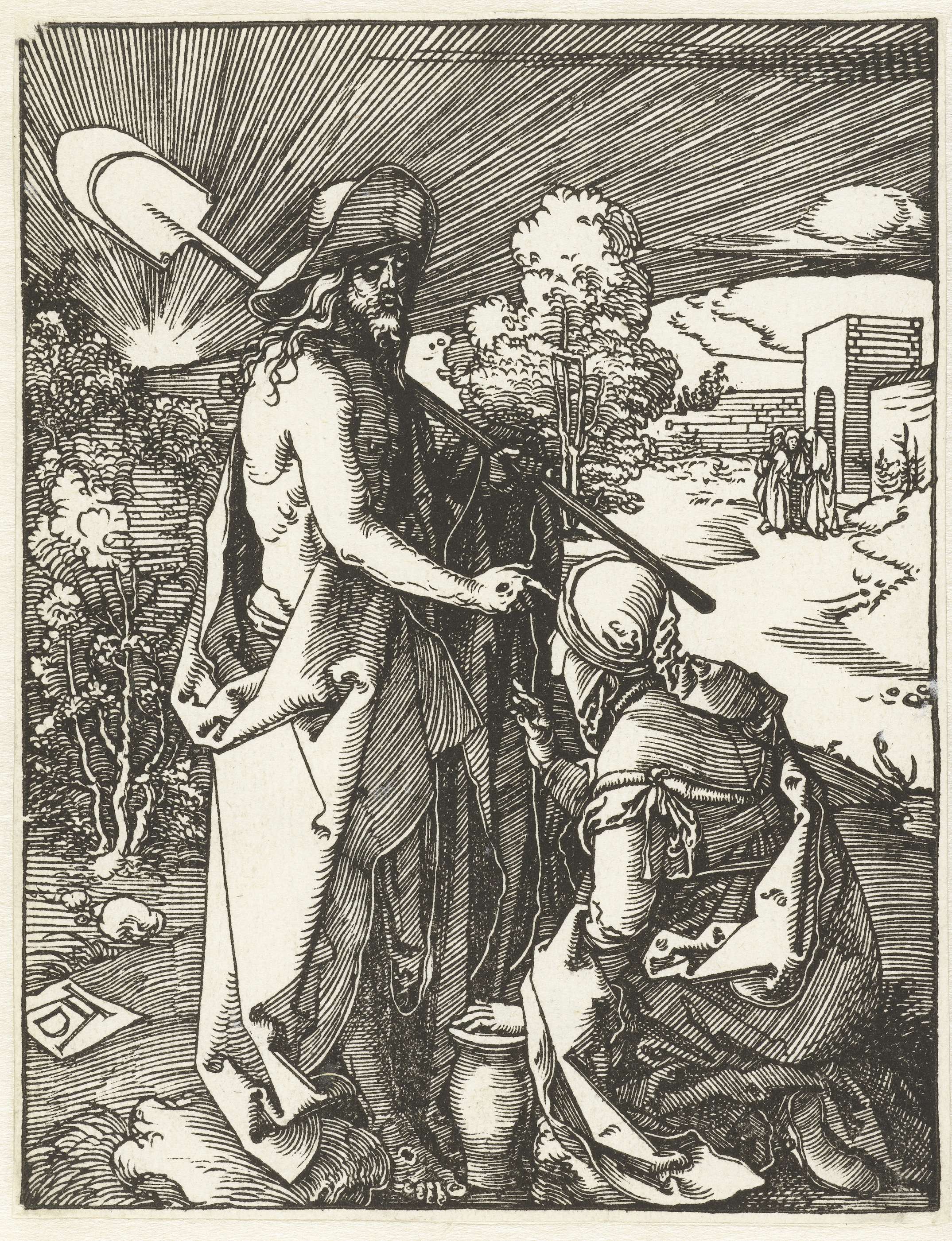 Christus, gekleed als tuinman, groet Maria Magdalena. Deze prent is onderdeel van de prentserie 'De kleine Passie', bestaande uit een titelprent en 36 bijbelse scènes (voornamelijk uit het Lijdensverhaal).