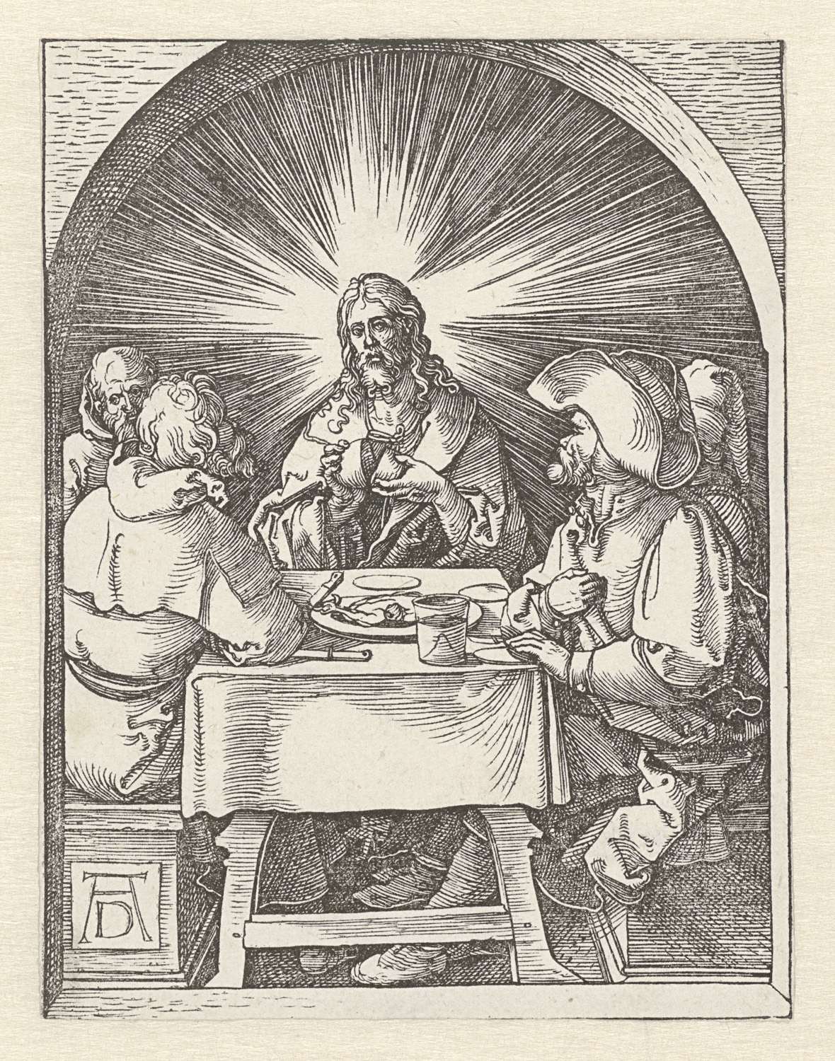 Christus breekt het brood aan tafel met vier heren te Emmaüs. Deze prent is onderdeel van de prentserie 'De kleine Passie', bestaande uit een titelprent en 36 bijbelse scènes (voornamelijk uit het Lijdensverhaal).