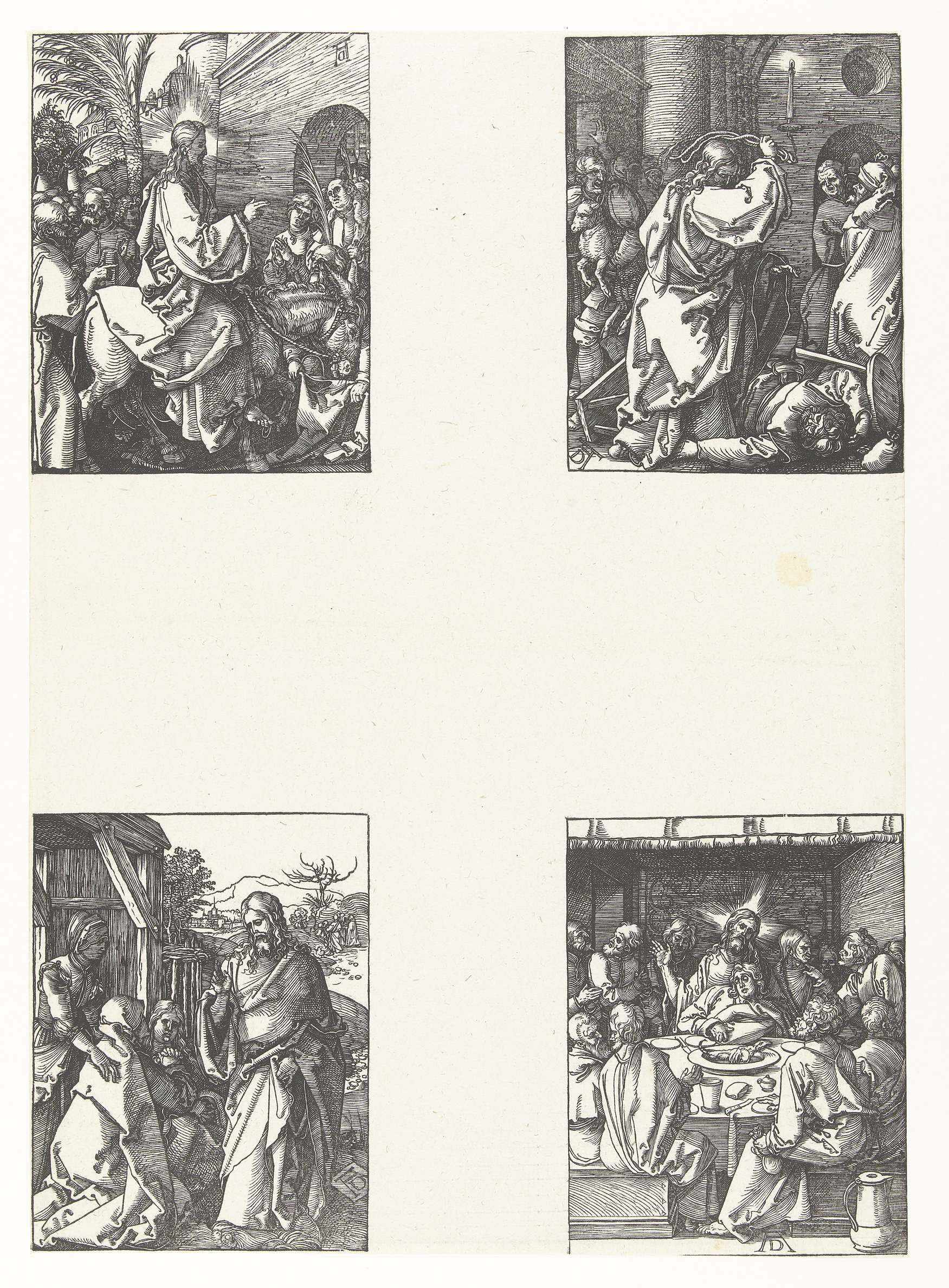 De tweede reeks van vier scènes uit de prentserie 'De kleine Passie', hier nog onversneden met 4 afbeeldingen op 1 blad. Linksboven: Christus rijdt op een ezeltje Jeruzalem binnen. Rechtsboven: Christus verdrijft met een zweep de geldwisselaars uit de tempel. Linksonder: Christus neemt afscheid van zijn moeder, die geknield voor hem zit, met twee andere ...